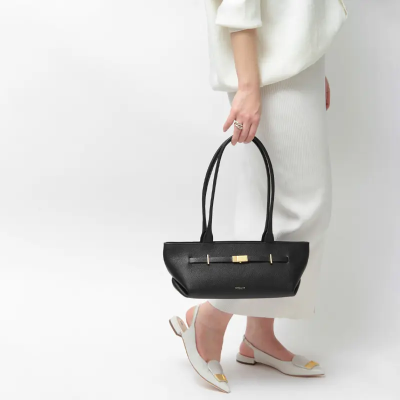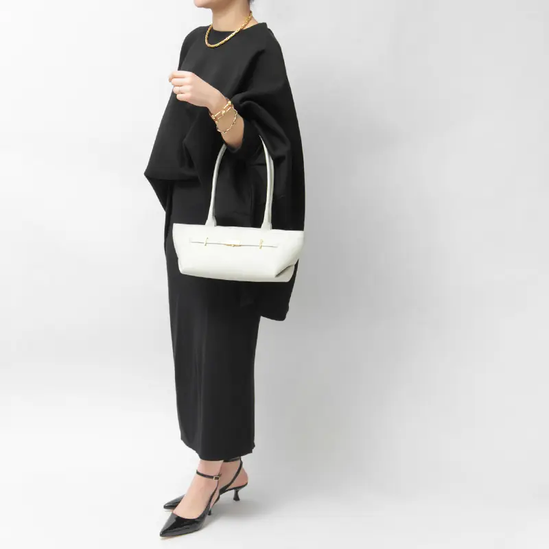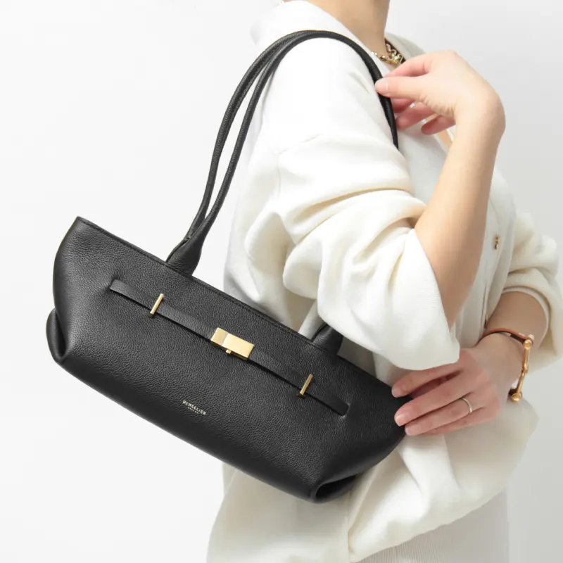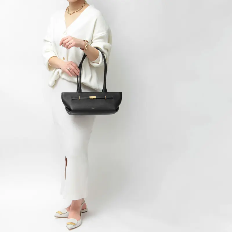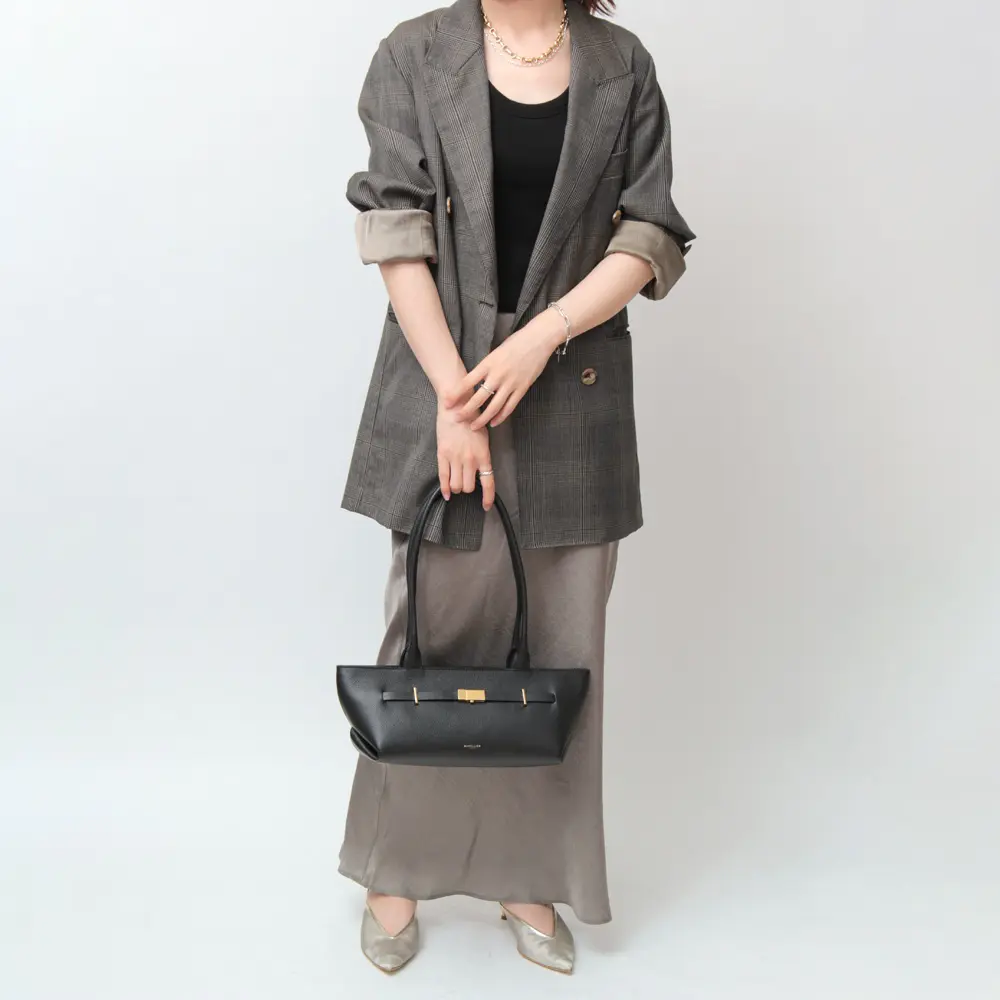 優雅なシボ感と柔らかさが楽しめるオールレザー仕様のトートバッグ。細いハンドルが特徴の横長ミニバッグは、ひとクセ効いたクールなバッグで、洗練されたきちんと感をプラスしてくれます。リッチなデザインだからこそ、エレガントなスーツスタイルから、デニムなどカジュアルな装いにもマッチします。