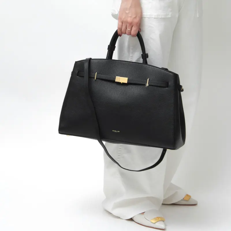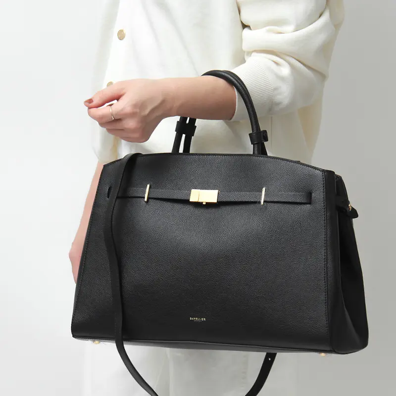 シンプルでスッキリとした力強いシルエットながら、湾曲したトップエッジが女性らしさを添える"DEMELLIER デメリエー"のトートバッグ。キャリアシーンに活躍するA4サイズ対応で、荷物に合わせてマチ幅を変えられる機能性も魅力。フロントのゴールドロックがアクセントとなり、毎日のビジネススタイルを格上げしてくれます。