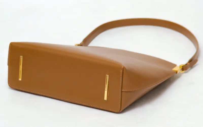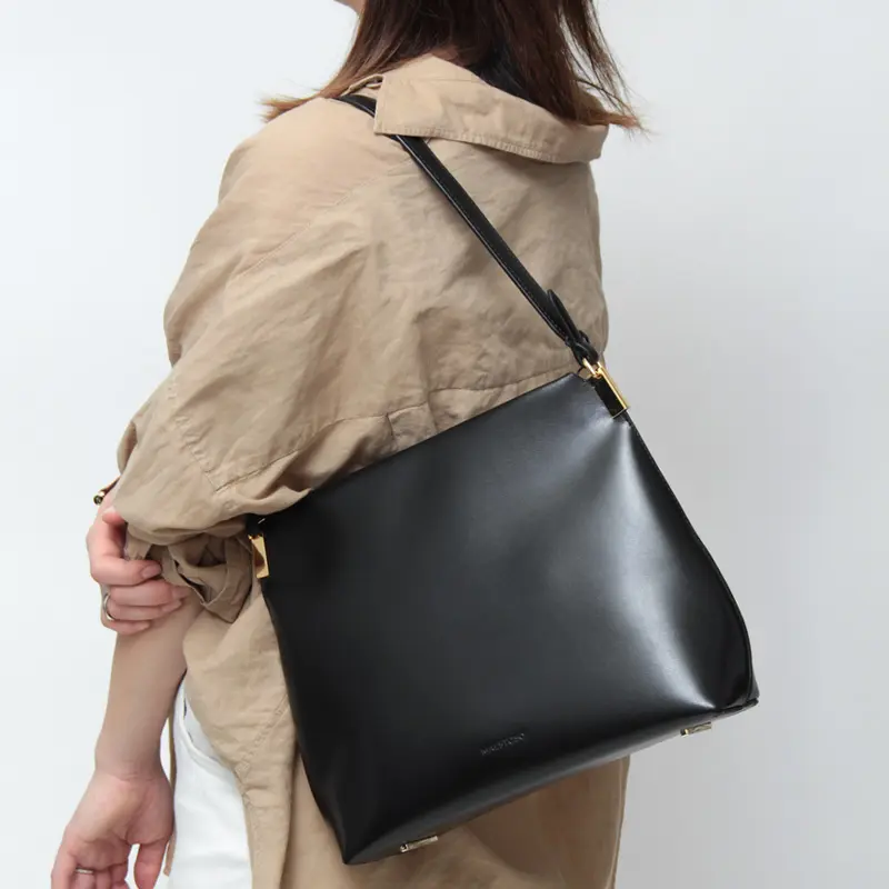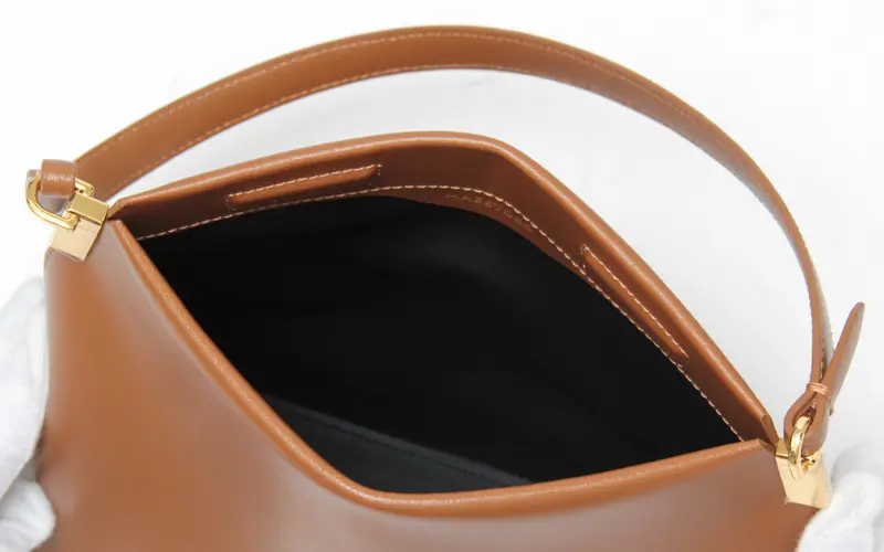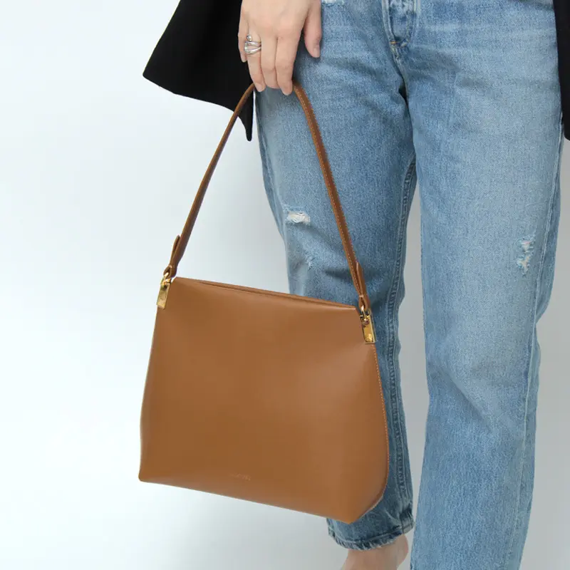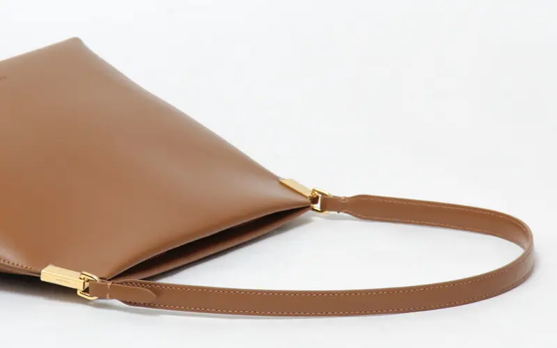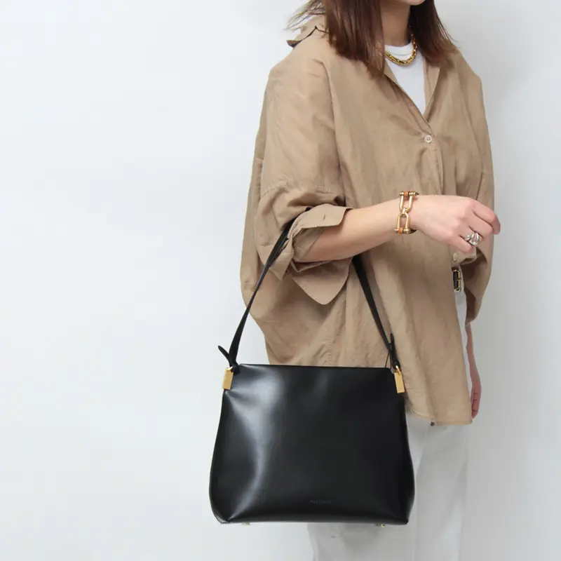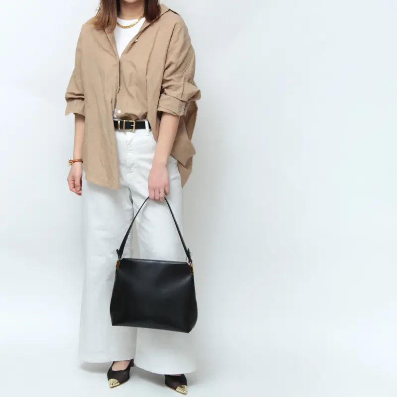 高級感を演出する牛革のショルダーは手馴染みも良い仕様です。長めのデザインなので肩にさっと掛けたり、ゆったりハンドまで、コーディネートに合わせてお楽しみいただけます。肩掛けで持った際に小脇にスッキリ収まるサイズ感で、フォルムが美しく見えるようにデザインされています。