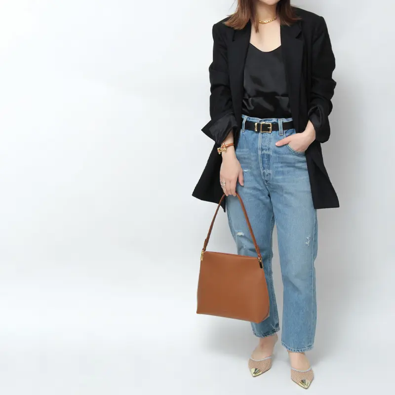 細いハンドルが特徴のレザーバッグは、すっきりとしたラインと洗練されたディテールで、きちんと感をプラスしてくれます。リッチなデザインだからこそ、エレガントなスーツスタイルから、デニムなどカジュアルな装いにもマッチします。