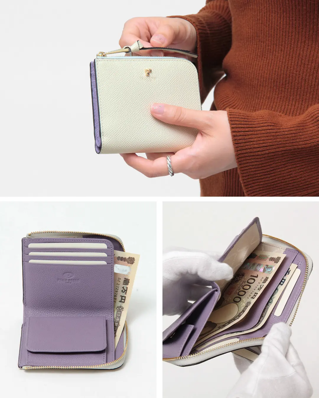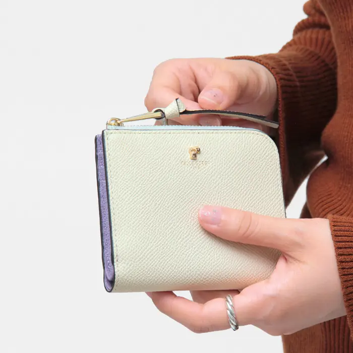 PELLE BORSA ペレボルサ Reinette luxe L字ファスナー 二つ折り ミニ財布 アイボリー/ラベンダー