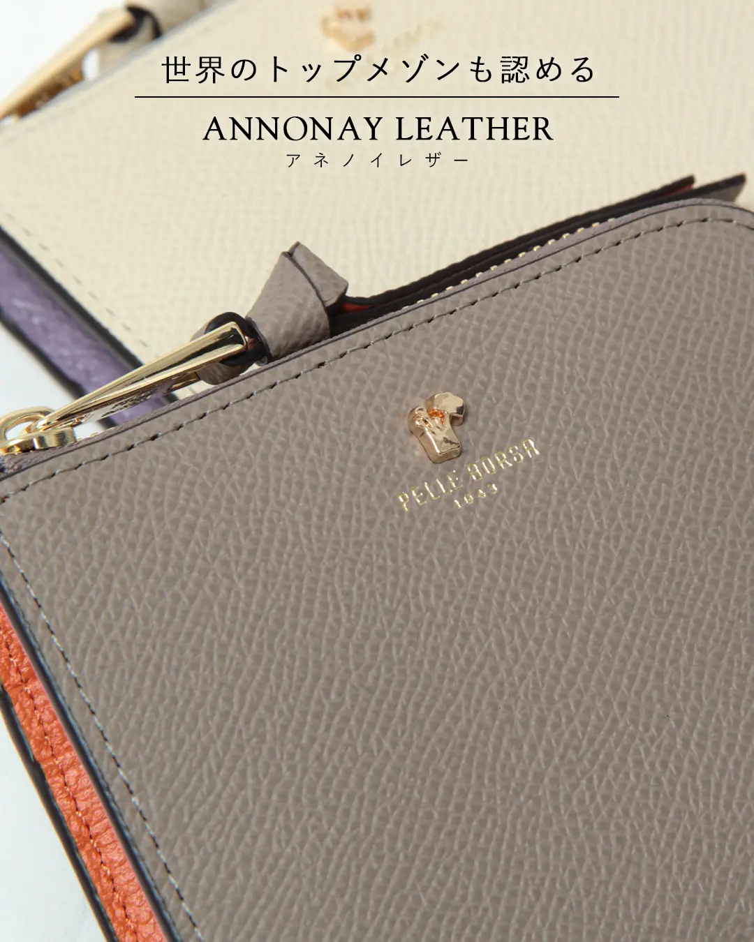 アノネイ社の革は、フランスの恵まれた自然環境で生まれた、滑らかで柔らかな質感が魅力です。健やかに育った牛と高品質な水を用いることで、天然皮革の美しさを最大限に引き出しています。その品質の高さは、世界の一流メゾンにも認められています。ぜひその特別な風合いをお楽しみください。
