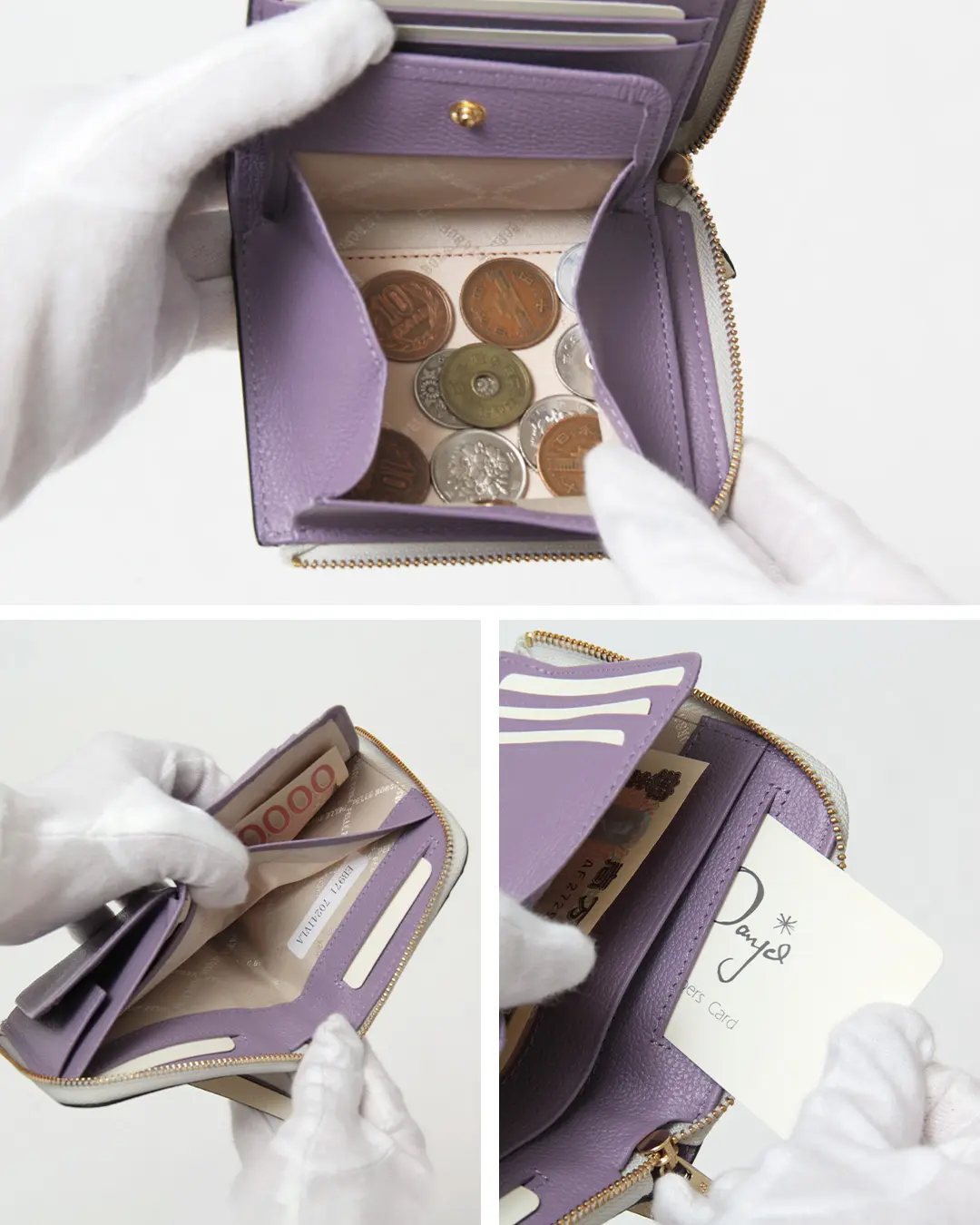 L字ファスナーを開くと、中身が一目で確認できる設計になっています。左手で持ったときにお金やカードが取り出しやすいよう、カードポケット、小銭入れ、お札スペースが工夫されています。スムーズにお会計ができる、使い勝手の良さが魅力のデザインです。