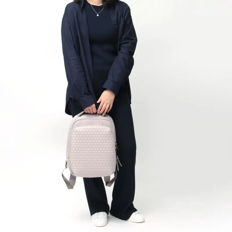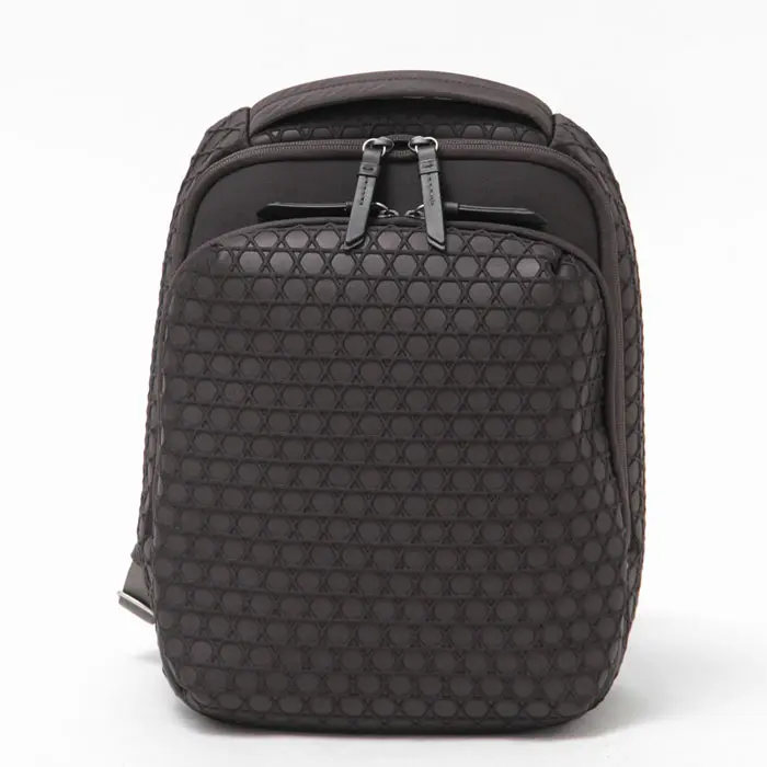 軽くて丈夫なポリウレタン素材にカゴメ柄を型押しした"LAQUOH /ラクーオ"の"篭目エンボスボンディング"シリーズ。A4サイズをゆったり収納できる大容量のリュックは、ミニマルなデザインながら存在感のある面持ち。撥水加工により突然の雨でも安心して使える実用的なバッグです。