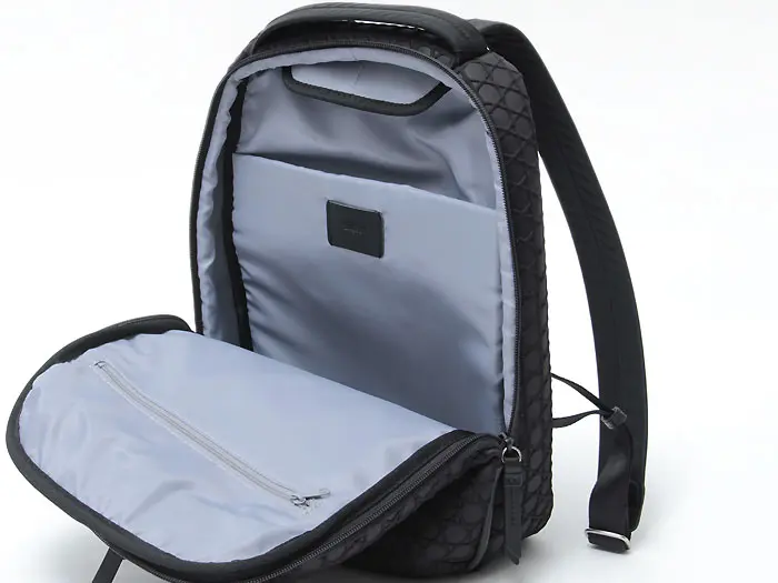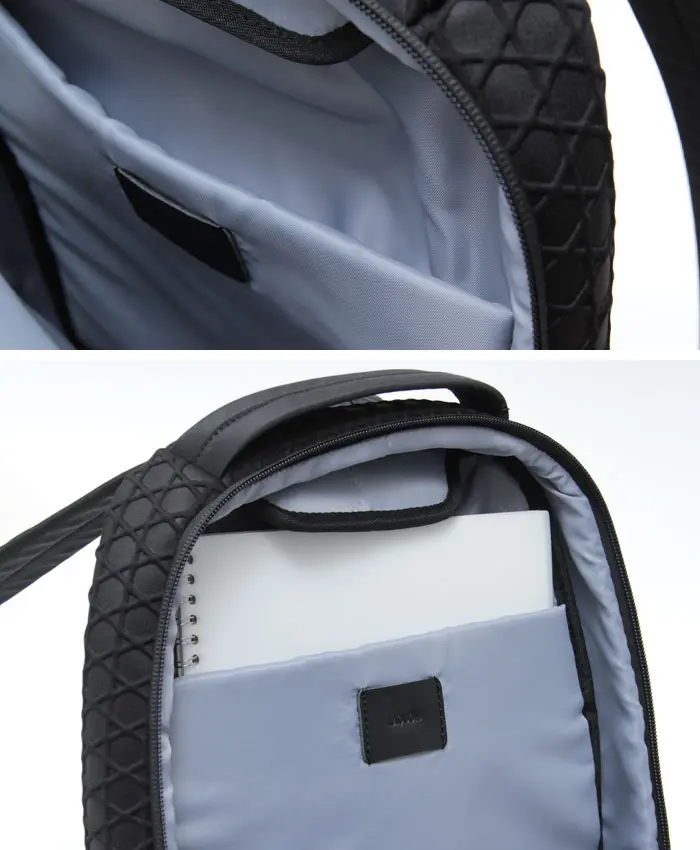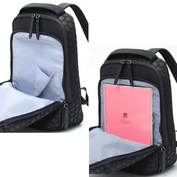メイン収納は羽織り物やお弁当も余裕で入るサイズ感です。A4サイズや15インチサイズ対応のクッションポケットを搭載。