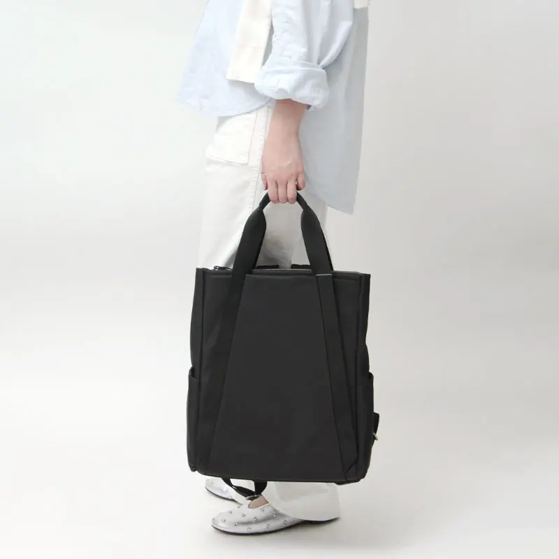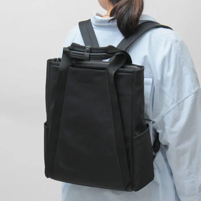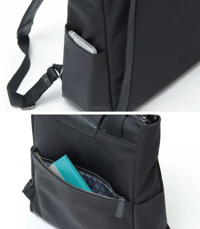 外側両サイドには携帯やペットボトルなど、頻繁に出し入れするアイテムを収納しやすいオープンポケットを配置。背面には手帳が横向きに収まるサイズのファスナーポケットを備え、お財布やパスポートなどの貴重品をしまっておくとセキュリティ面でも安心です。