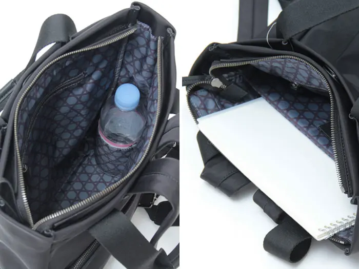 背面内側にはA4サイズ対応のオープンポケット、正面内側にはファスナーポケットを配置し、小物を仕分け収納して整理しやすい設計です。さらに、両サイドにはペットボトルホルダーを備え、水筒や折り畳み傘を立てて収納することができます。
