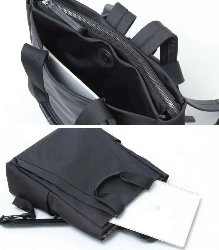 開閉はファスナー仕様。A4サイズのファイルやノートパソコンに加え、お弁当も収まる、頼もしい収納力を備えています。