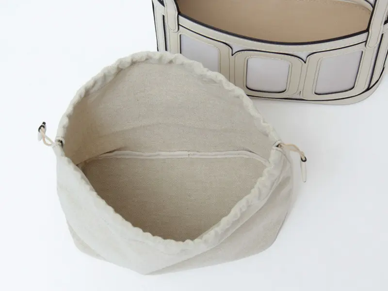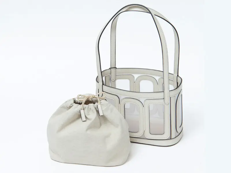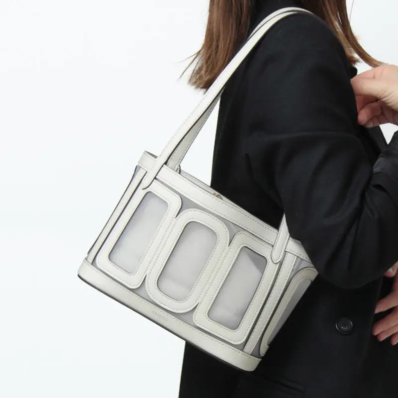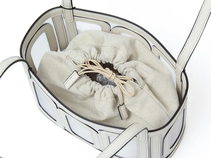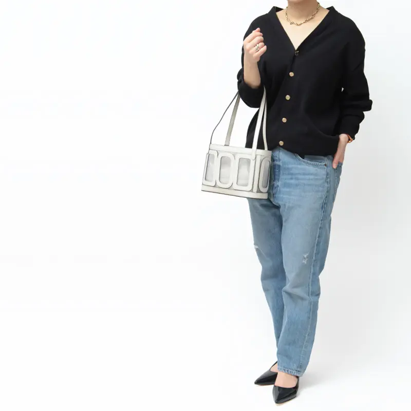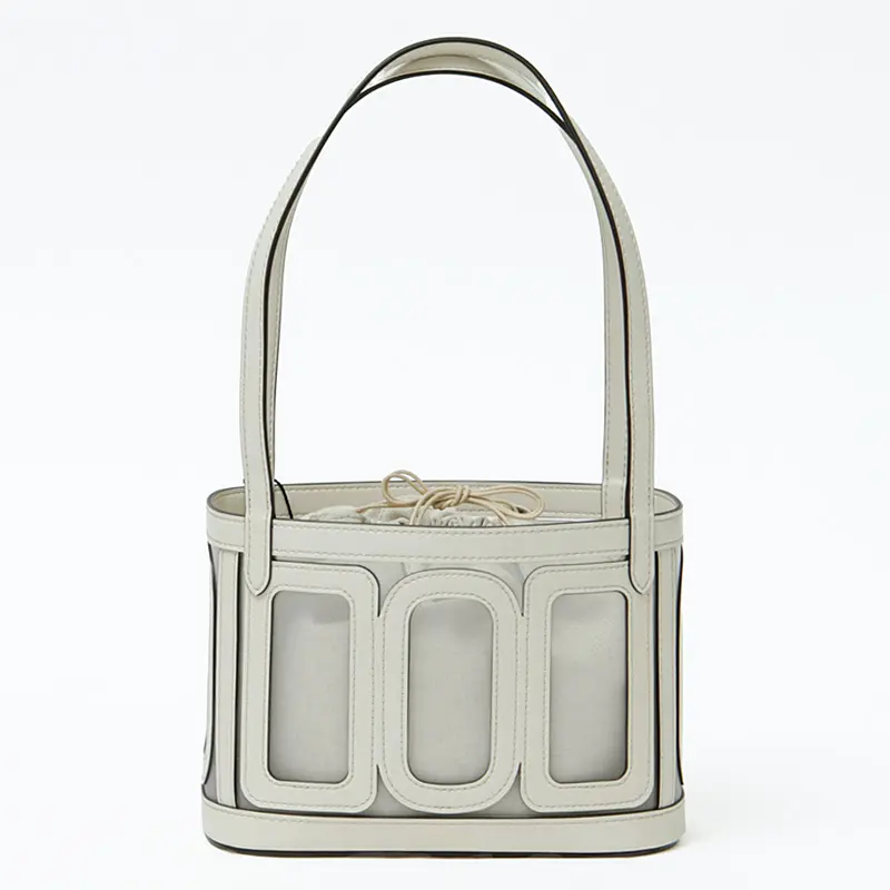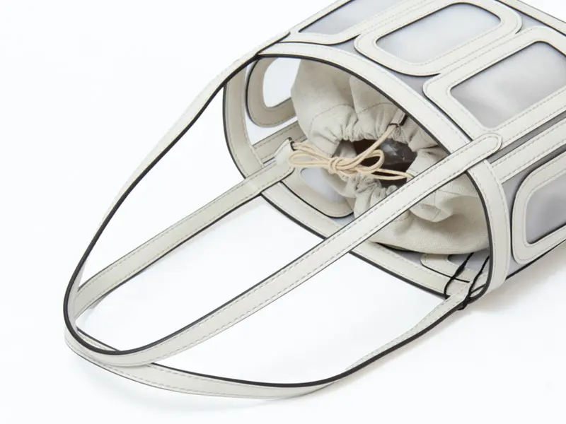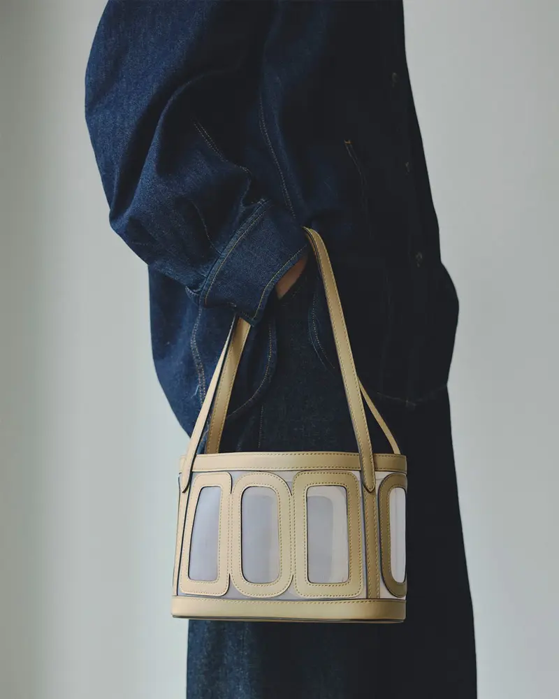 四角と楕円のカッティングを施したPVCにチュール素材を組み合わせています。PVCはレザーのような上質感のある見た目で、チュールのシアー感が春夏らしい清涼感や心地よさをもたらします。いつもの着こなしにさらりと加えれば、軽やかな印象に仕上げてくれます。