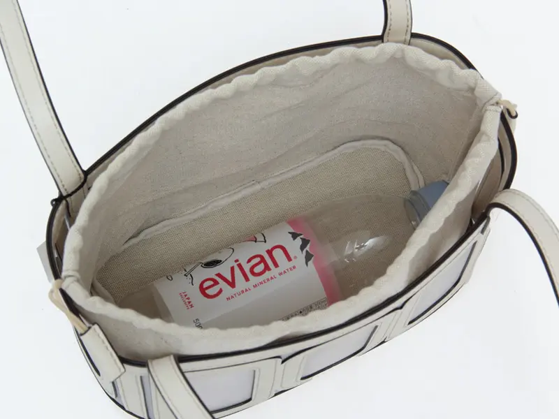 目隠しや仕分けに便利な巾着が付いています。500mlのペットボトルがぴったり横に入るサイズ感で、長財布やスマホ、ポーチ、エコバッグなどお出かけに必要なアイテムがしっかり収納可能。大きすぎず小さすぎない絶妙なサイズで、使いやすさが魅力です。