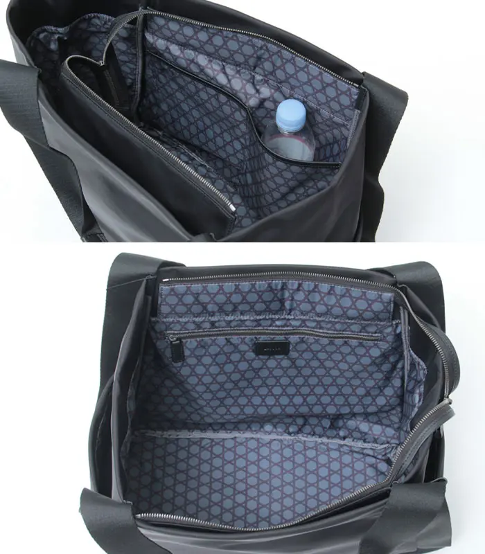 ガバッと大きく開く広々としたメインルーム。開閉は天ファスナー仕様で、バッグの中身が飛び出す心配もなく、防犯面も安心です。A4サイズのファイルやノートパソコンに加え、1泊分の着替えも収まる、頼もしい収納力を備えています。