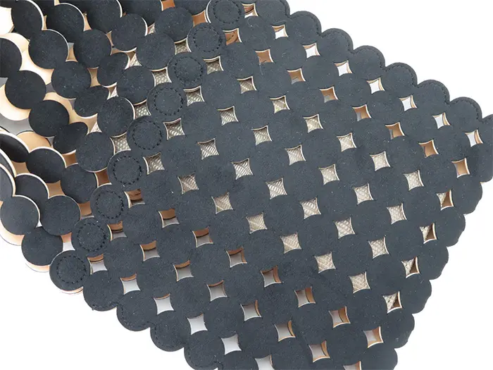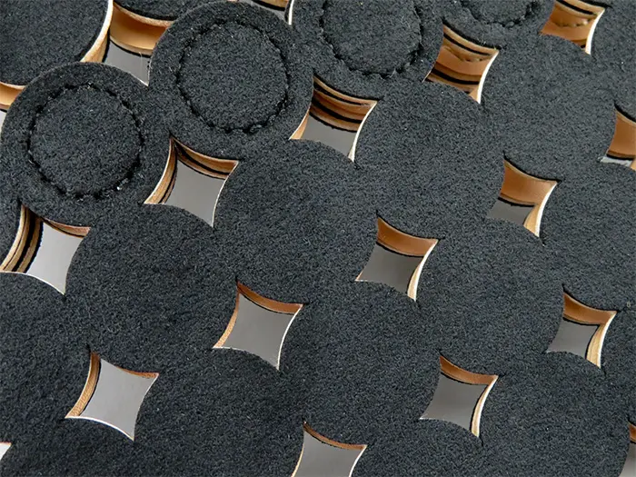 まるで月を思わせる丸いカッティングを施したウルトラスエード。高い機能性と耐久性、メンテナンス性を兼ね揃えています。シワになりにくく、型くずれしにくい、水に濡れても乾けば元通りの風合いを取り戻す万能素材。リアルスウェードのような滑らかな手触りでありながら、ポリエステル・ポリウレタン素材でできているので天然皮革のおよそ半分の重さでとても軽量です。