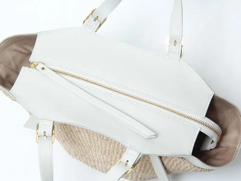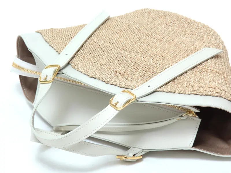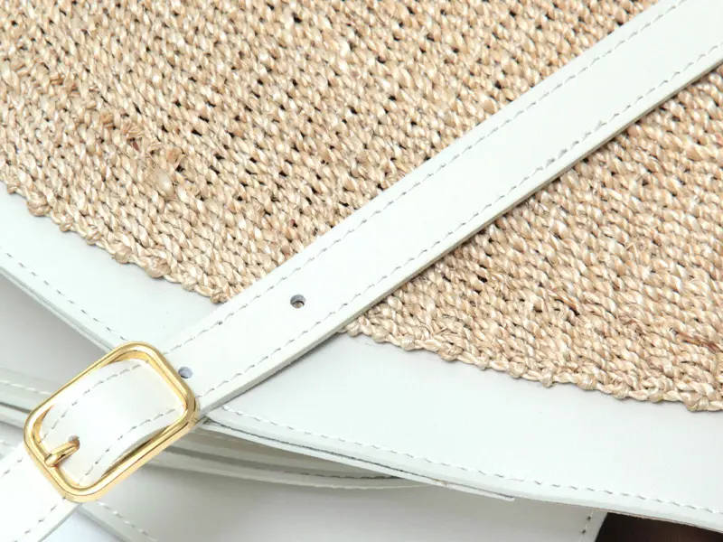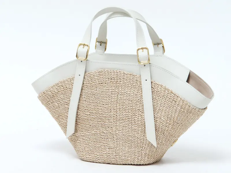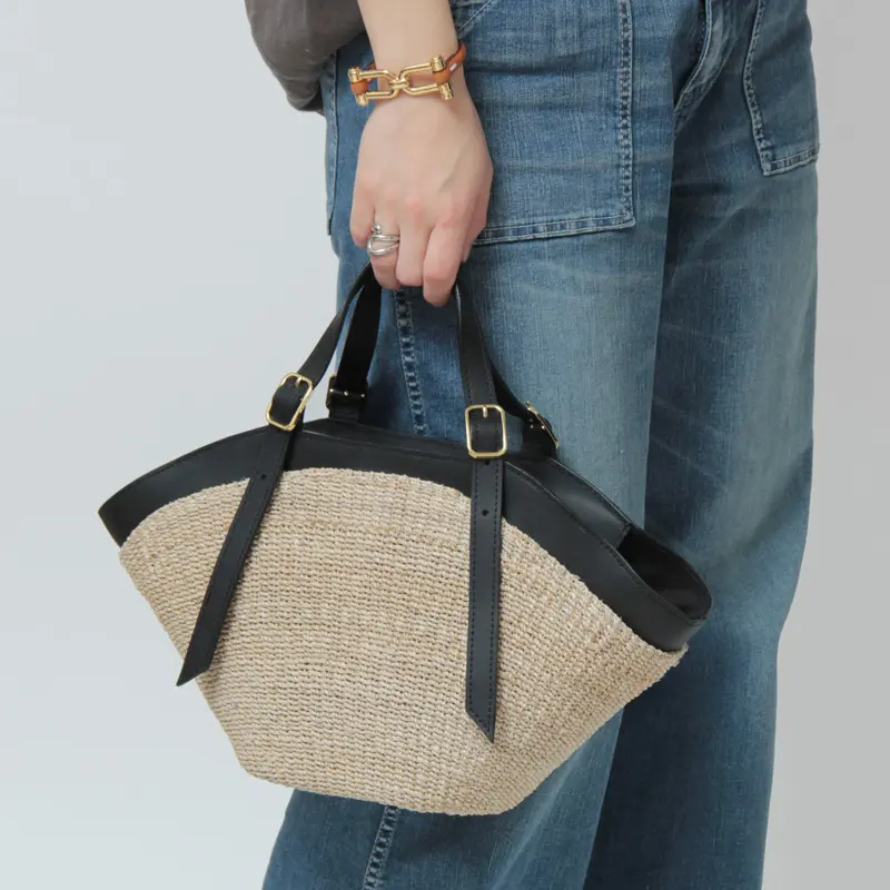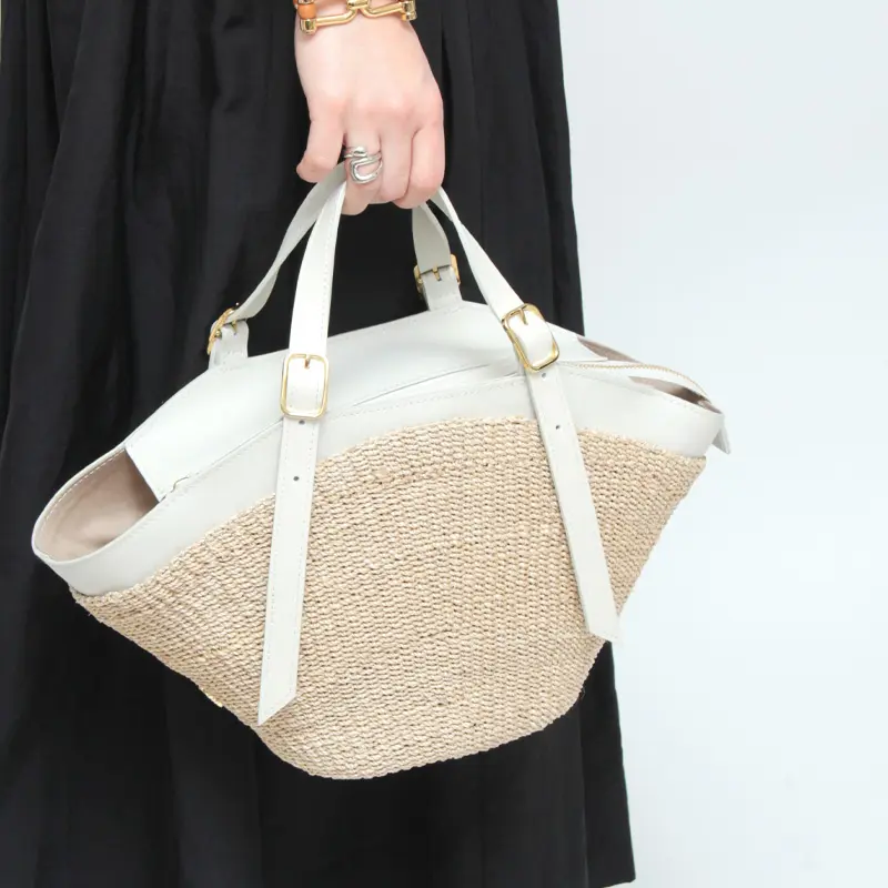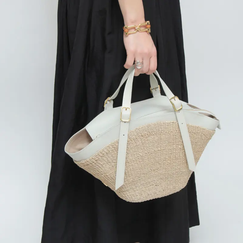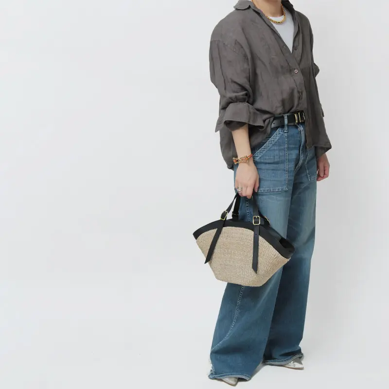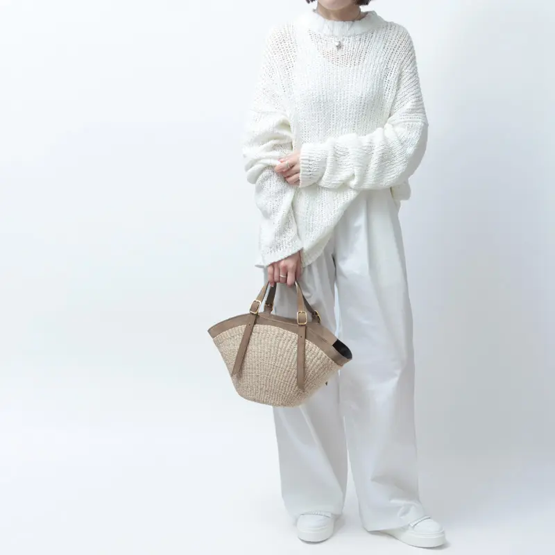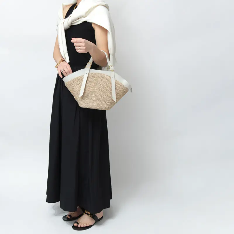 本体素材はファインアバカを使用しています。通常のアバカよりも網目が細かく、しなやかな仕上がり。レザーはスムース調のイタリアンスプレットレザーを使い高級感をプラスします。天然素材ならではのナチュラル感がありながらも、品よくお持ちいただけます。