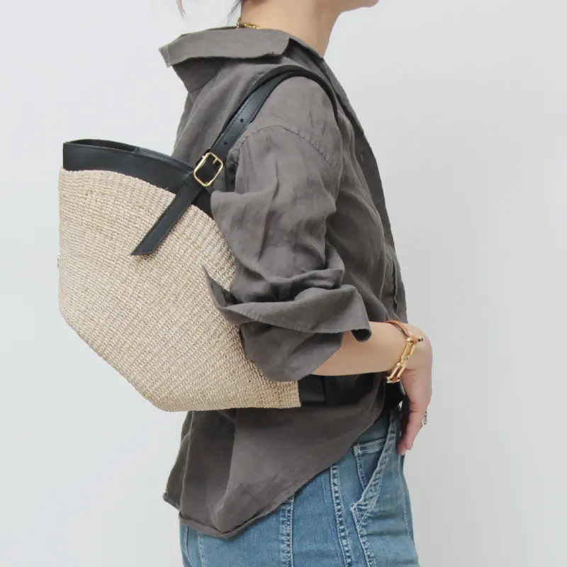 本体素材はファインアバカを使用しています。通常のアバカよりも網目が細かく、しなやかな仕上がり。レザーはスムース調のイタリアンスプレットレザーを使い高級感をプラスします。天然素材ならではのナチュラル感がありながらも、品よくお持ちいただけます。