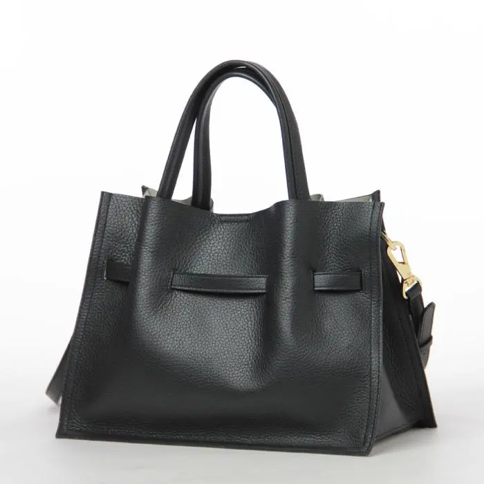柔らかなシボ型押しイタリアンレザーが上質感を演出する"VIOLAd'ORO ヴィオラドーロ"の"TRERO トレロ"シリーズ。スクエアシルエットに、ターンロックベルトが上品なアクセントを添えるトートバッグは、広めのマチで収納力があり、ショルダーストラップ付きの2WAY仕様。普段使いや通勤シーンでも活躍する優秀バッグです。