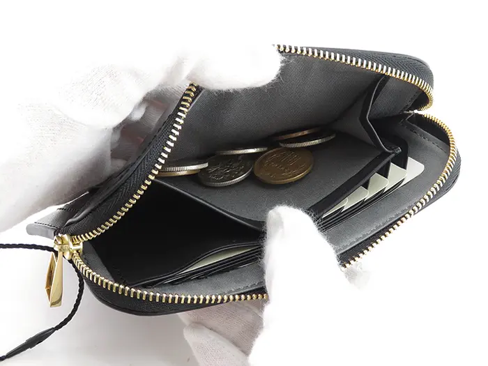 開閉はファスナー仕様で、サイドまでジップが施されているので、しっかりと開きます。メイン部分にはお札が二つ折りで入ります。