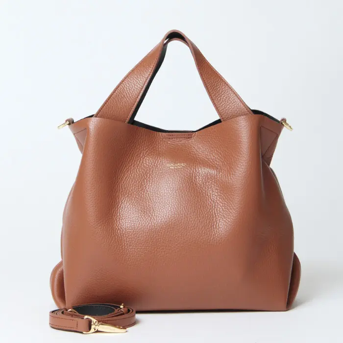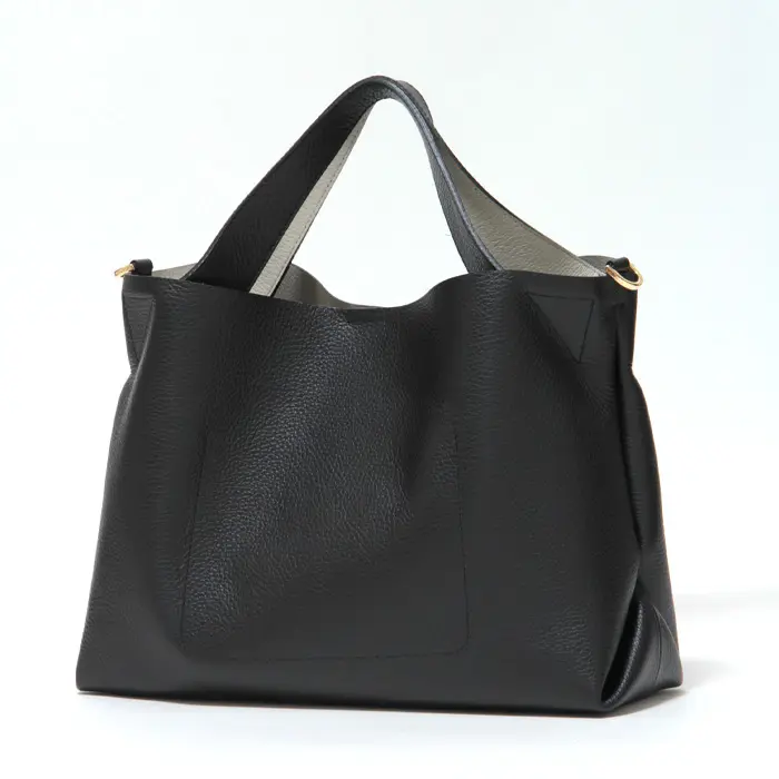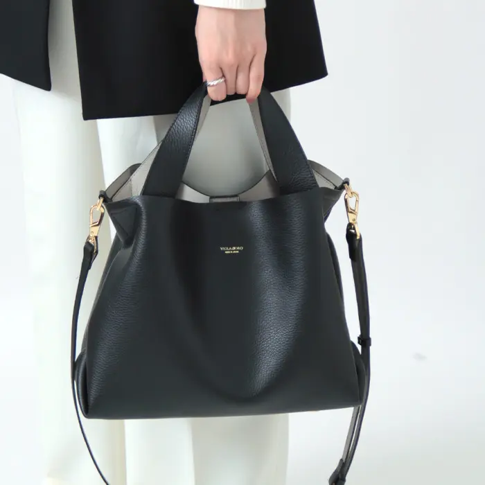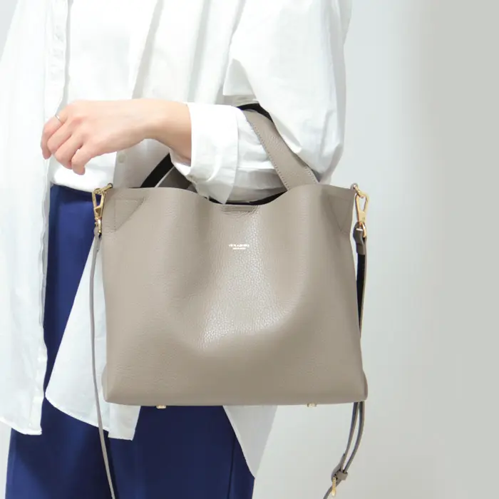 シンプルながらもシルエットが印象的な"VIOLAd'ORO ヴィオラドーロ"のトートバッグ。上品なシボ型押しのダブルフェイスレザーを使用した"TRERO トレロ"シリーズです。お財布などの必需品+αの荷物がきれいに収まり、普段使いに丁度良いサイズ感。斜めがけもできる2way仕様で移動も便利です。きれいめなお洋服にも合い、通勤やオケージョンなど幅広いシーンで活躍してくれます。