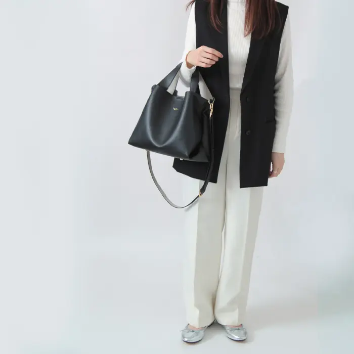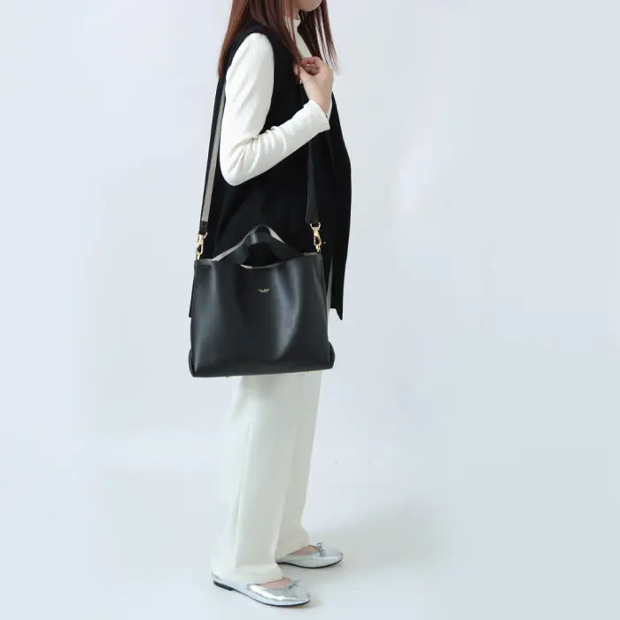 太めにデザインされたハンドルは握りやすくて◎ レザーが柔らかく、くったりとしたシルエットはこなれた雰囲気を醸します。ショルダーストラップは華奢で斜め掛け姿も上品に見せてくれます。両手が空くので移動にも便利です。