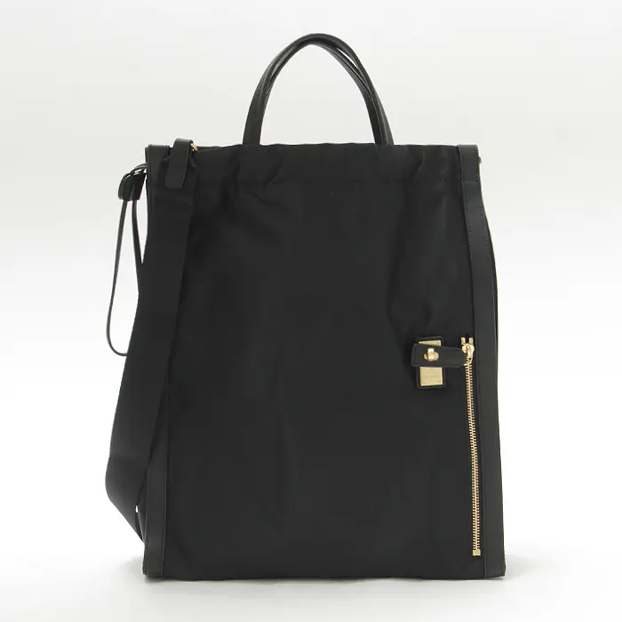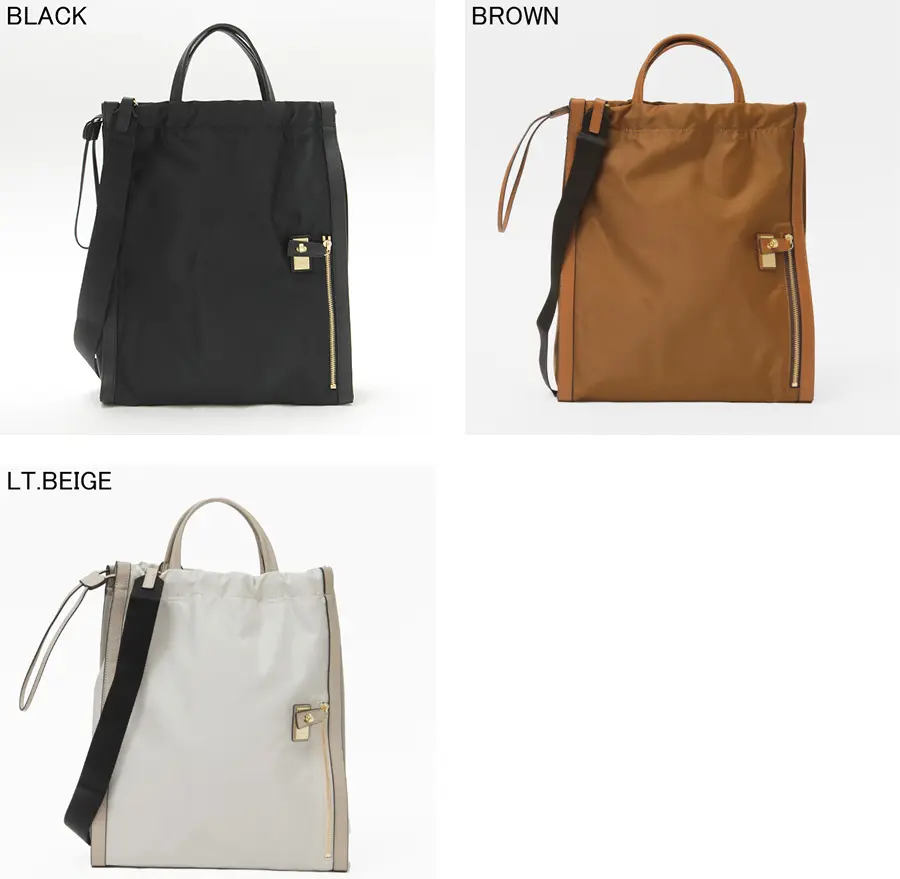 光沢のある上品なナイロンはとても軽量。カジュアルなイメージのナイロン素材ですが、黒のボディにゴールドのひねり金具が特別感があり、スタイリングに上品さをプラスしてくれます。