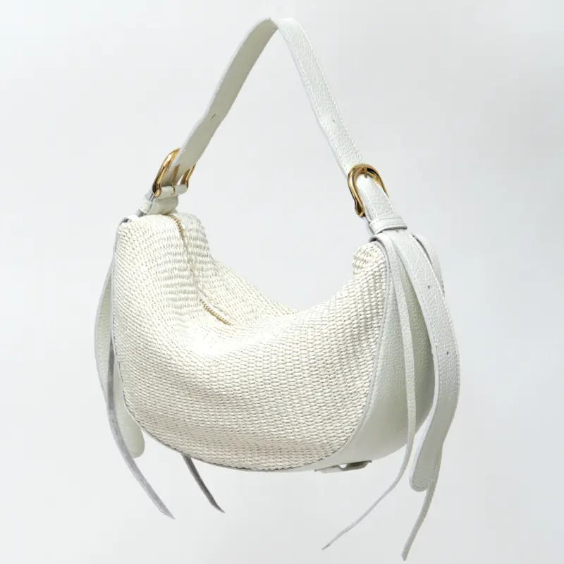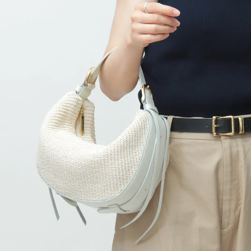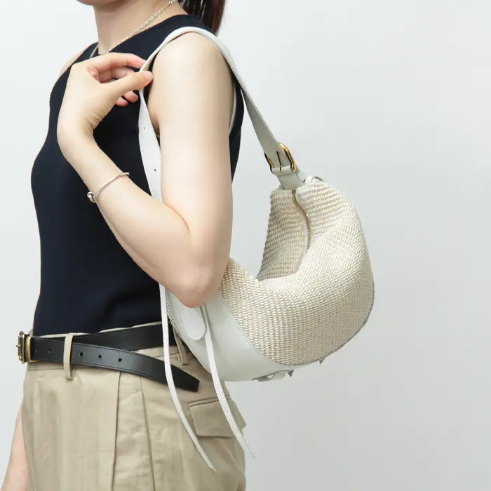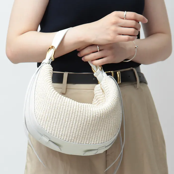 ラフィア調素材と上品な本革を組み合わせた"VIOLAd'ORO ヴィオラドーロ"のワンショルダーバッグ。三日月型のフォルムに、サイドからルーズに垂れ下がる長いレザーコードやベルトがオシャレ心をくすぐるモードなアイテムです。ミニサイズなのでアクセサリー感覚でコーデに合わせやすく、季節感が一気に高まります。