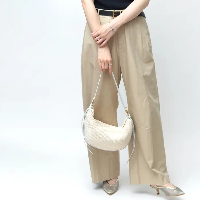 コロンとした三日月型のシルエットは、肩掛けで持った際に小脇にスッキリ収まり、フォルムが美しく見えるようにデザインされています。