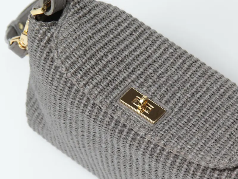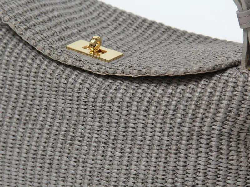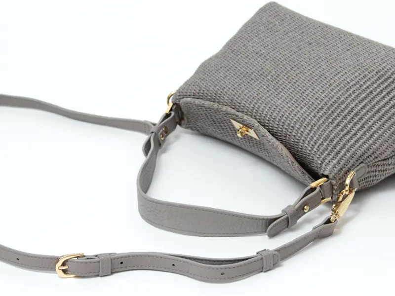 本体素材はコットンとポリアミドでできたイタリア製のラフィア調シートです。従来の手編みのかごバッグでは表現しづらいトレンド感のあるクリーンなデザインで、引っ掛かりのない滑らかな肌触りが特徴です。また天然素材に比べ、劣化しにくく、多少の雨でも安心してお持ちいただけます。