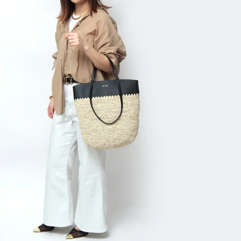 季節感ある天然素材のラフィアとレザーWハンドルがポイントの"VIOLAd'ORO ヴィオラドーロ"のかごバッグ。涼しげでナチュラルな風合いにリアルレザーが加わり、波模様のアクセントがプラスされて、大人かわいい雰囲気に仕上がっています。箔押しされたブランドロゴや刻印を施した美しい金具使いが大人の手元を彩ります。A4サイズ対応の収納力で春夏の通勤バッグにもおすすめです。
