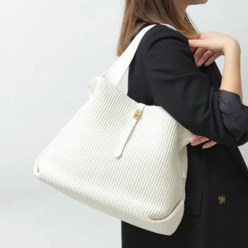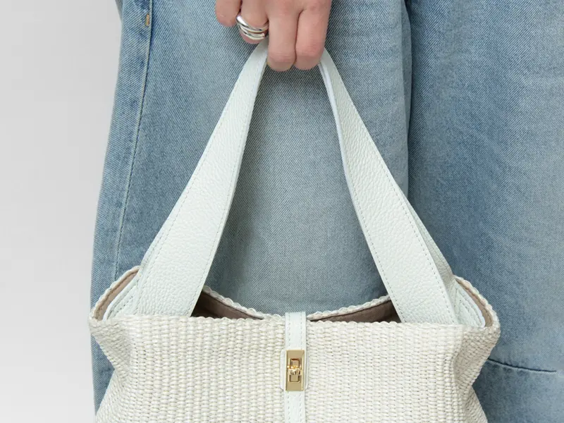 本体素材はコットンとポリアミドでできたイタリア製のラフィア調シートです。従来の手編みのかごバッグでは表現しづらいトレンド感のあるクリーンなデザインで、引っ掛かりのない滑らかな肌触りが特徴です。また天然素材に比べ、劣化しにくく、多少の雨でも安心してお持ちいただけます。
