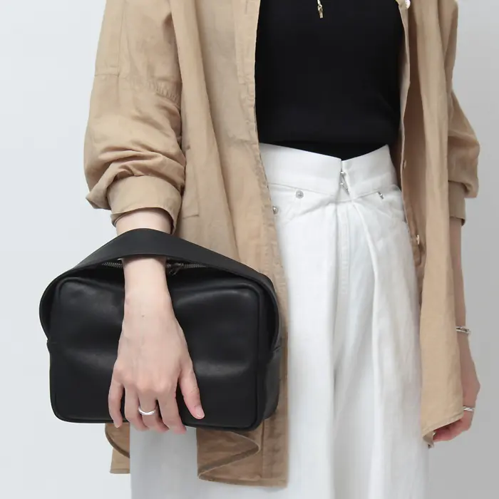 リネンや革など素材と国内製法にこだわったバッグブランド「MORMYRUS」。 マットなツヤ感が美しい牛革を使用した小振りなハンドバッグは、丸みを帯びたスクエア型が愛らしく、ミニマムなサイズながら長財布を無理なく収納できる程よいサイズ感。 レザーの上質感が引き立つオールブラックのシンプルなデザインで、タイムレス・エイジレスにお楽しみいただける逸品です。