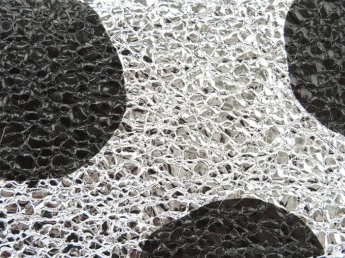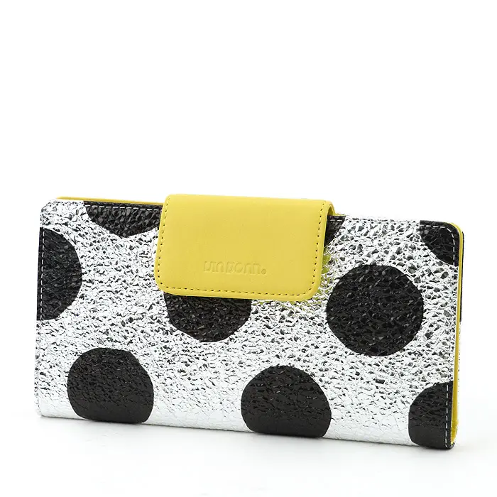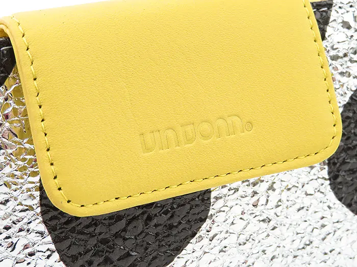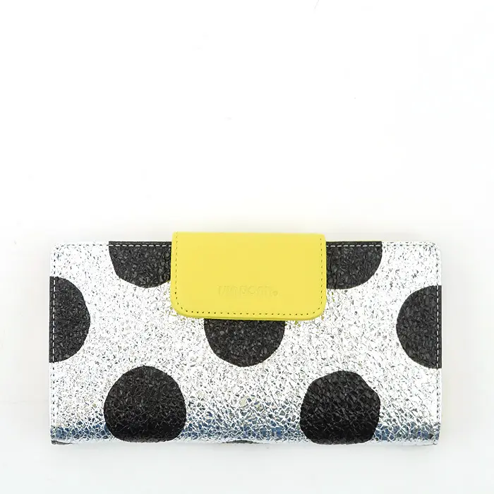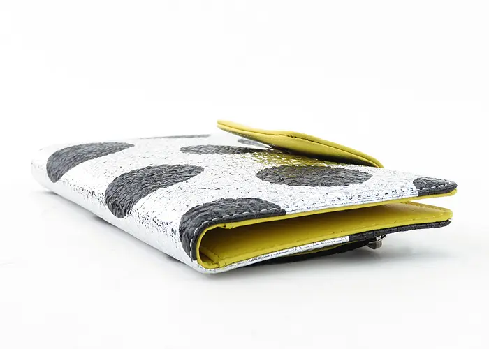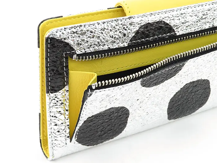 シルバー箔を加工した豚革にドットをプリントしています。フラップとカード収納は黄色の牛革。シルバー箔に合わせて金具はシルバー、ドットに合わせてファスナーテープと裏地のナイロンをブラックに統一することで、派手さの中にも落ち着きのある雰囲気を持ち合わせています。