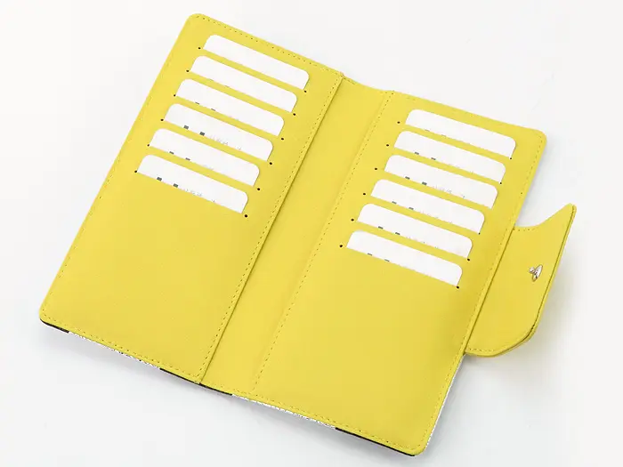 きらきら輝くシルバーのメタリックレザーにブラックの大きなドット柄が新鮮な"Roco ロコ"シリーズ。開閉のフラップとカード収納はフレッシュなイエローで、明るい気分になるようなアクセントを効かせています。 カードがたくさん入るカード入れ。お札も入る大きさと、ファスナーポケットが付いているので、お財布としてもお使いいただける便利なデザインです。