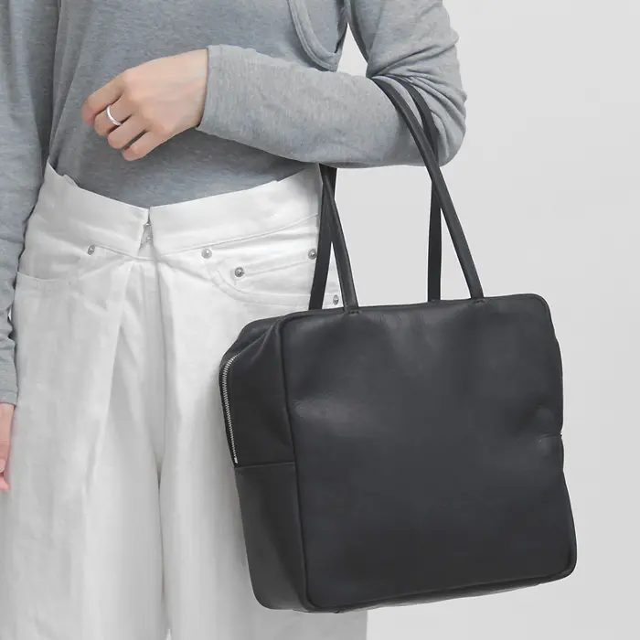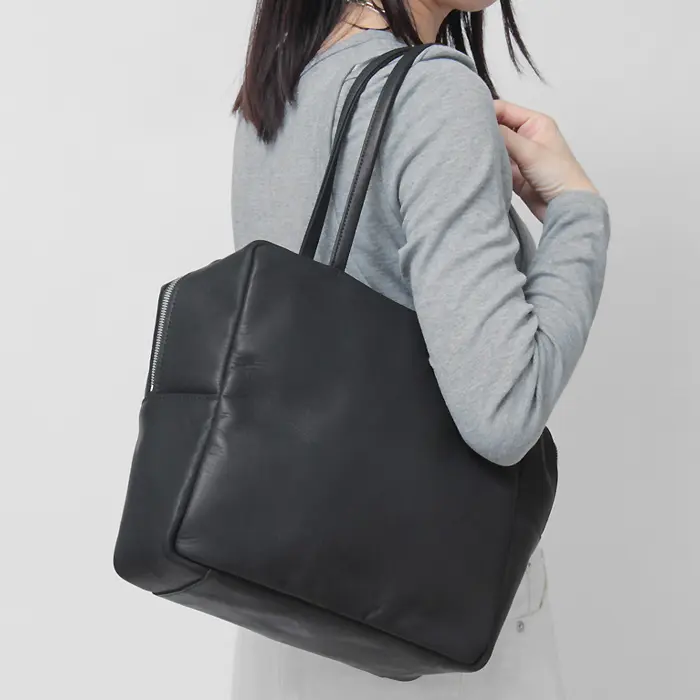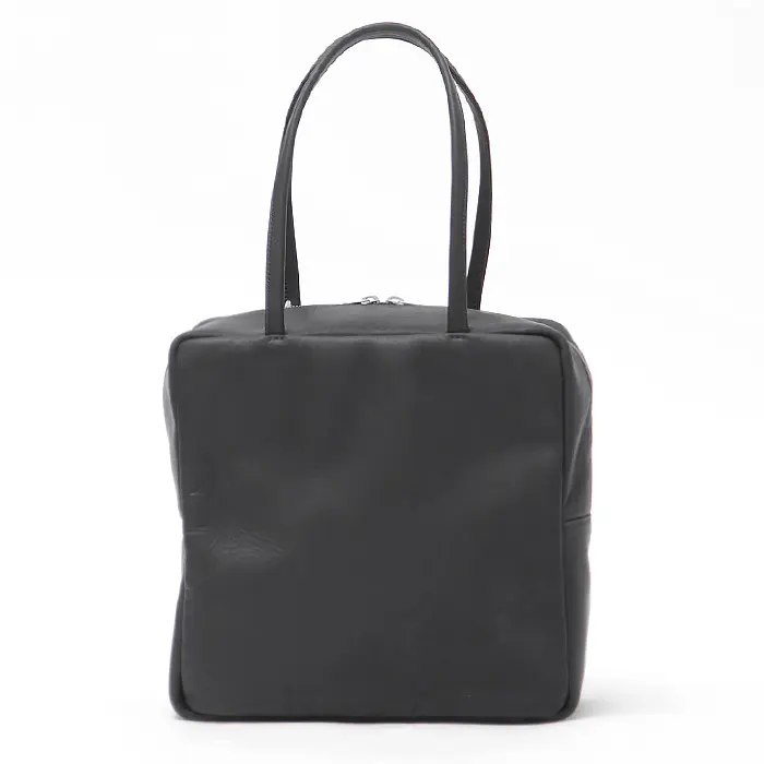 リネンや革など素材と国内製法にこだわったバッグブランド「MORMYRUS」。 マットなツヤ感が牛革を使用したスクエア型のトートバッグは、マチがたっぷりあるので、お出かけの必需品もゆったり収まり収納力抜群。 レザーの上質感が引き立つオールブラックのシンプルなデザインで、タイムレス・エイジレスにお楽しみいただける逸品です。