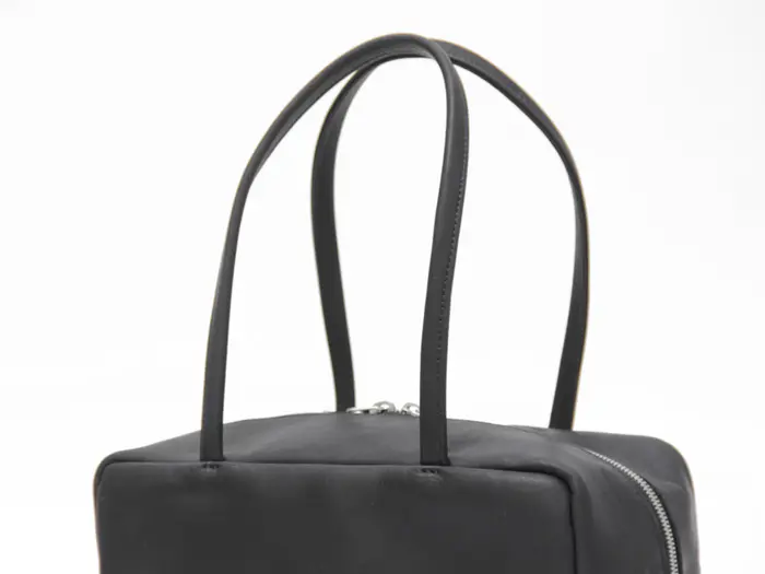 ほっそりとした持ち手は丸みを帯びた断面で、手に優しくフィットします。華奢に見えてもしっかりと縫い付けられているので、重いものも安心して入れることができます。