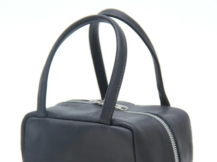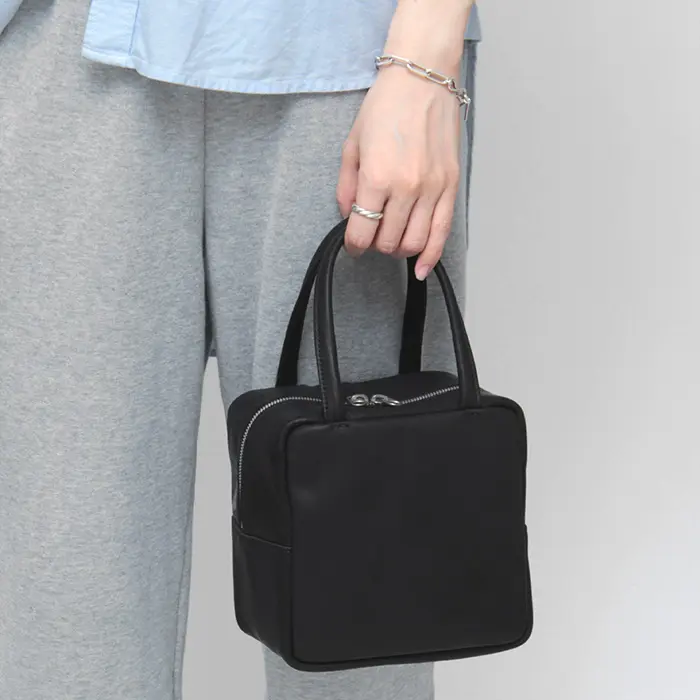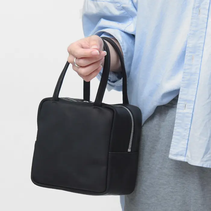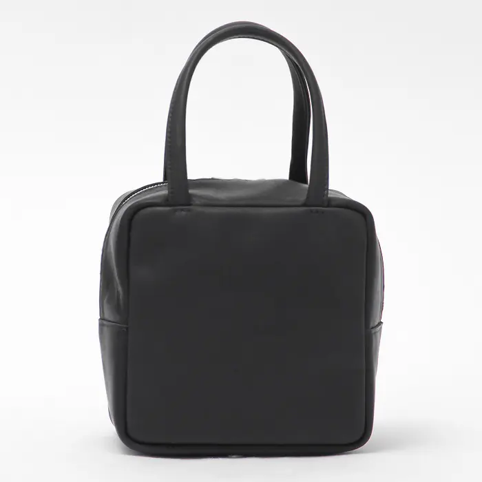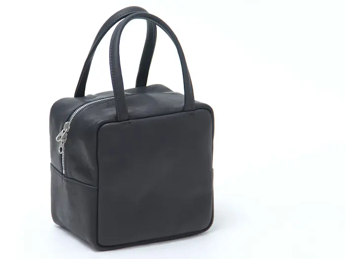 リネンや革など素材と国内製法にこだわったバッグブランド「MORMYRUS」。 マットなツヤ感が美しい牛革を使用した小振りなキューブ型のハンドバッグは、丸みを帯びた正方形が愛らしく、ミニマムなサイズながらポーチなど必要なものを無理なく収納できる程よいサイズ感。 レザーの上質感が引き立つオールブラックのシンプルなデザインで、タイムレス・エイジレスにお楽しみいただける逸品です。