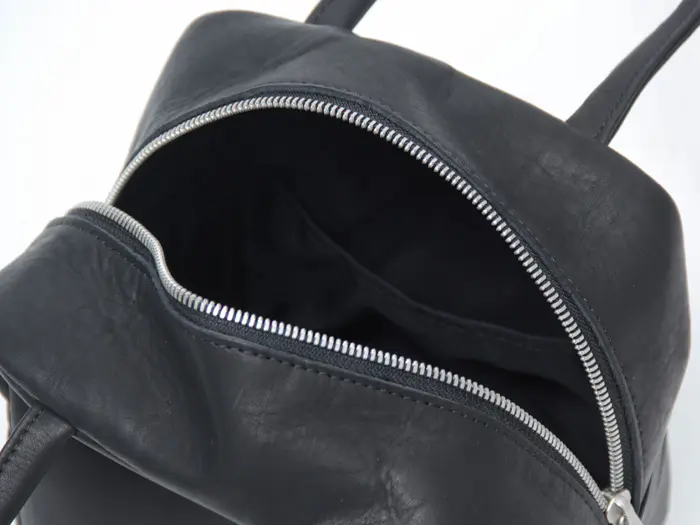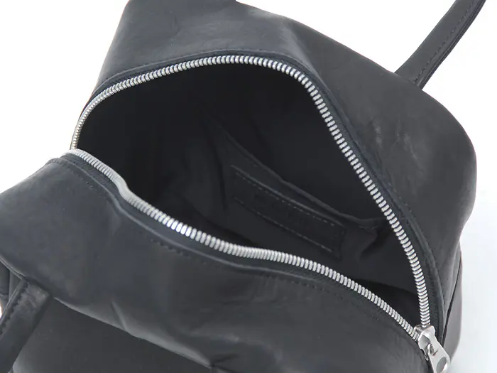 開閉はサッと開けられて荷物の出し入れがしやすいダブルジップの仕様。バッグの半分以上を開けられるファスナーと、柔らかくしなやかな牛革で、開口部がとても大きく開きます。中身がパッと見やすく荷物の出し入れもスムーズです。