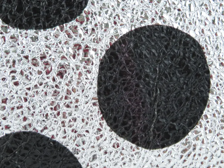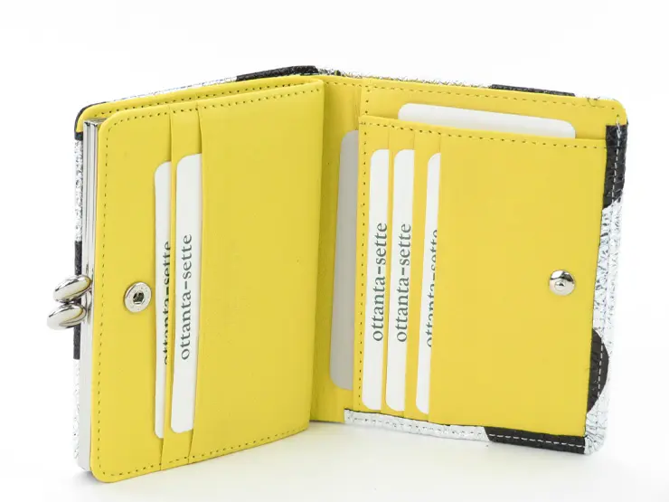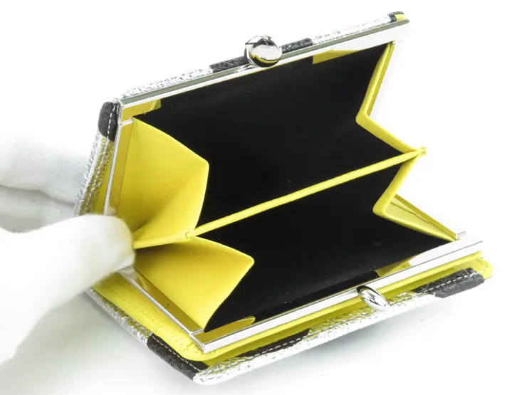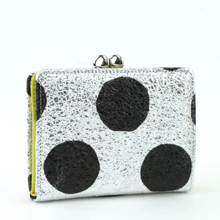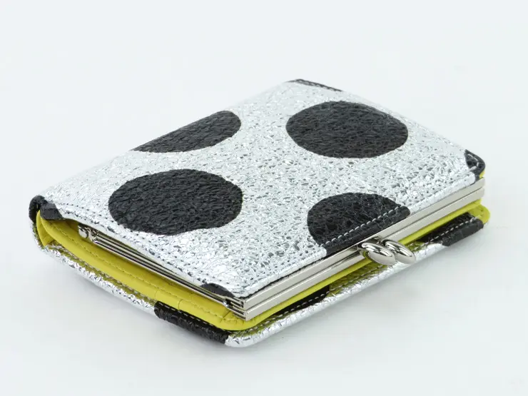きらきら輝くシルバーのメタリックレザー(豚革)に手書き風のドット柄を施し、遊びの効いた大人可愛いデザインのがま口ミニ財布。サイドから覗くイエローがパンチを効かせ、はっと目をひく華やかさがまとえるお財布です。