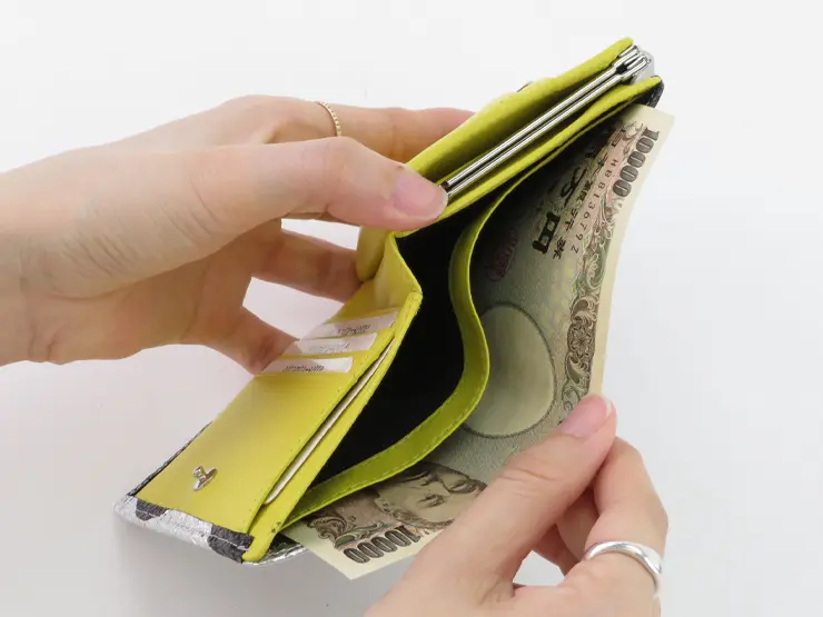 大きく口が開き使い勝手抜群のがま口仕様の小銭入れは、収納部分が二つに分かれ、スムーズにお会計できます。