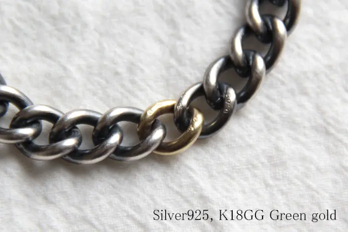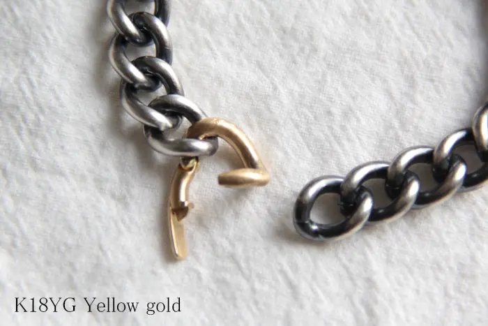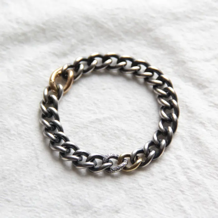 燻したシルバーチェーンにゴールドとダイヤモンドの輝きを加えたラグジュアリーなブレスレット。存在感がありながらも、上品な手元を演出します。同シリーズのリングと合わせたり、お手持ちのアクセサリーとの組み合わせもお楽しみください。