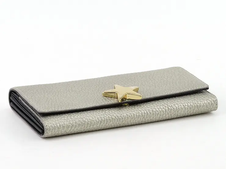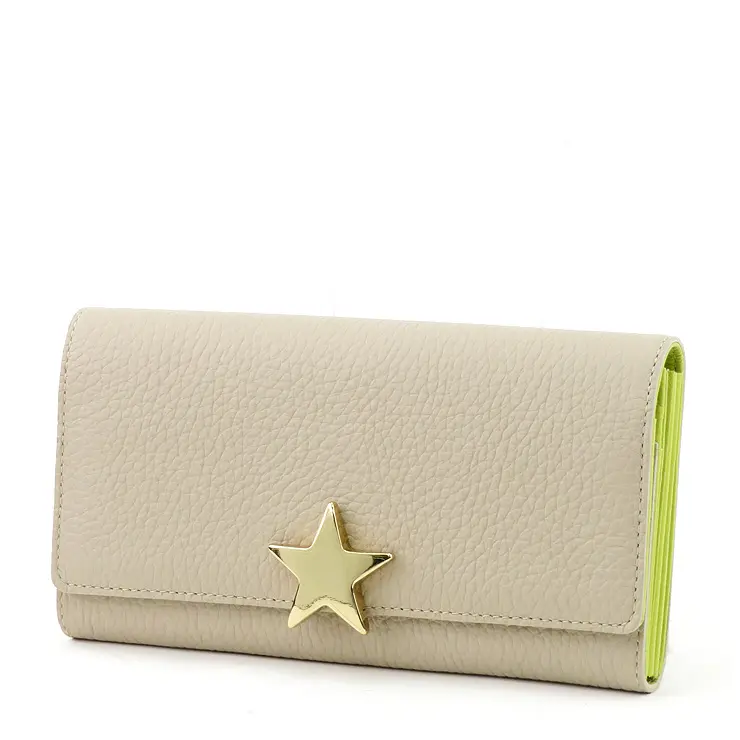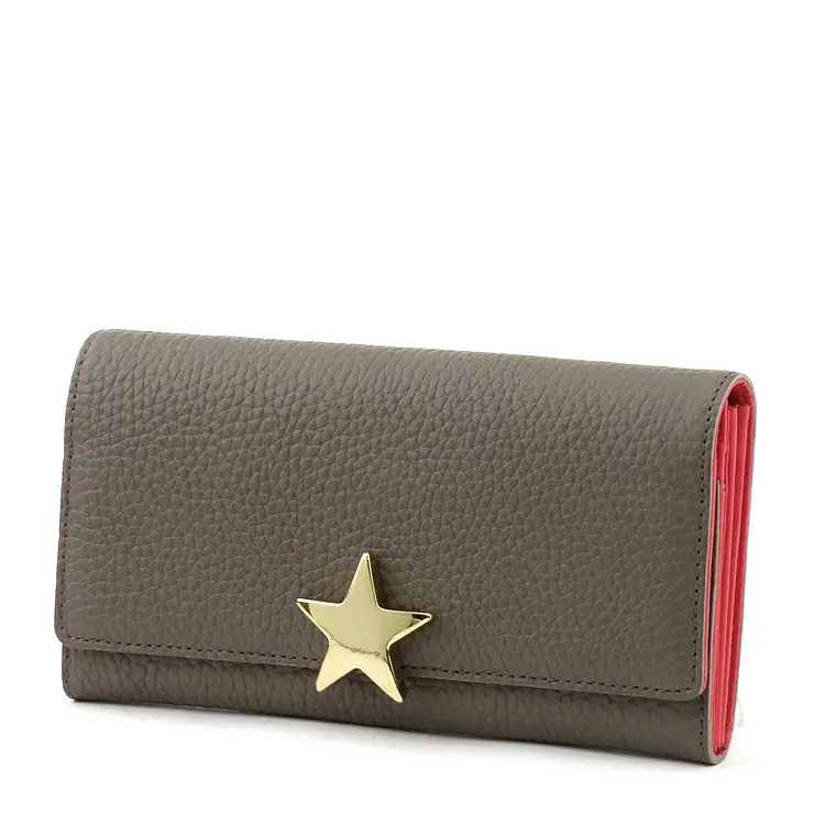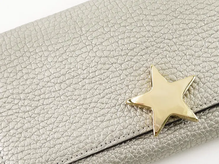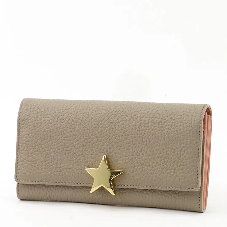 上質感漂うシボの効いた牛革。柔らかく手触り抜群です。星型のゴールド金具がシンプルなお財布に可愛さと上品さをプラスしてくれます。