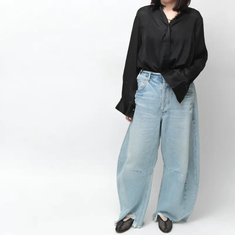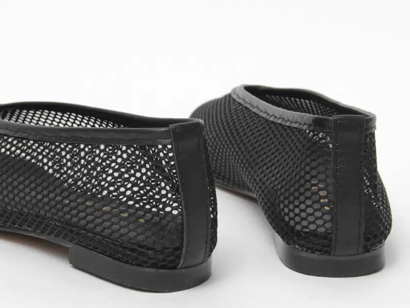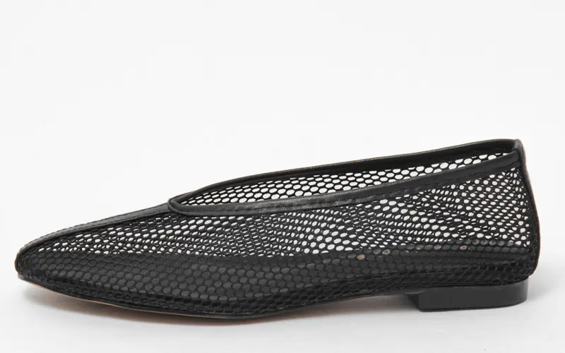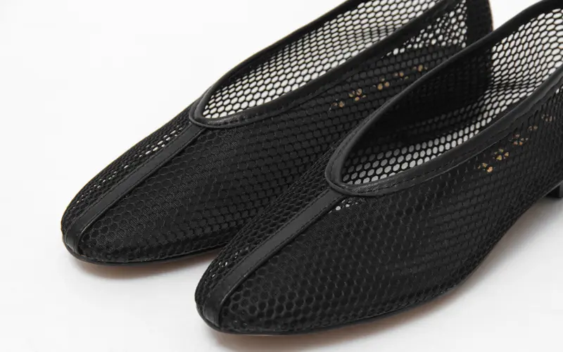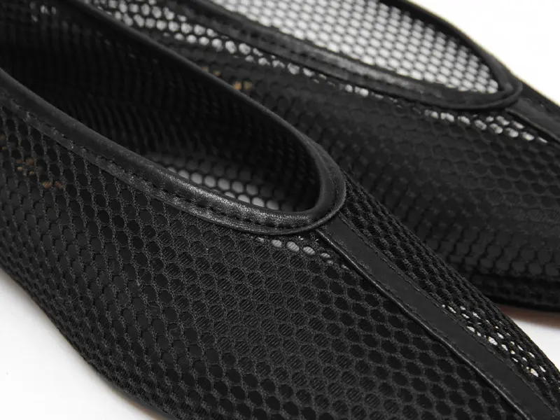 履き口は深めのカッティングでつま先からかかとまでしっかりと足をホールドしてくれます。柔らかいメッシュ素材を使用しているため、窮屈感が少なく、足に馴染みやすいのが魅力です。素足でも勿論、ソックスやタイツとの組み合わせも◎。