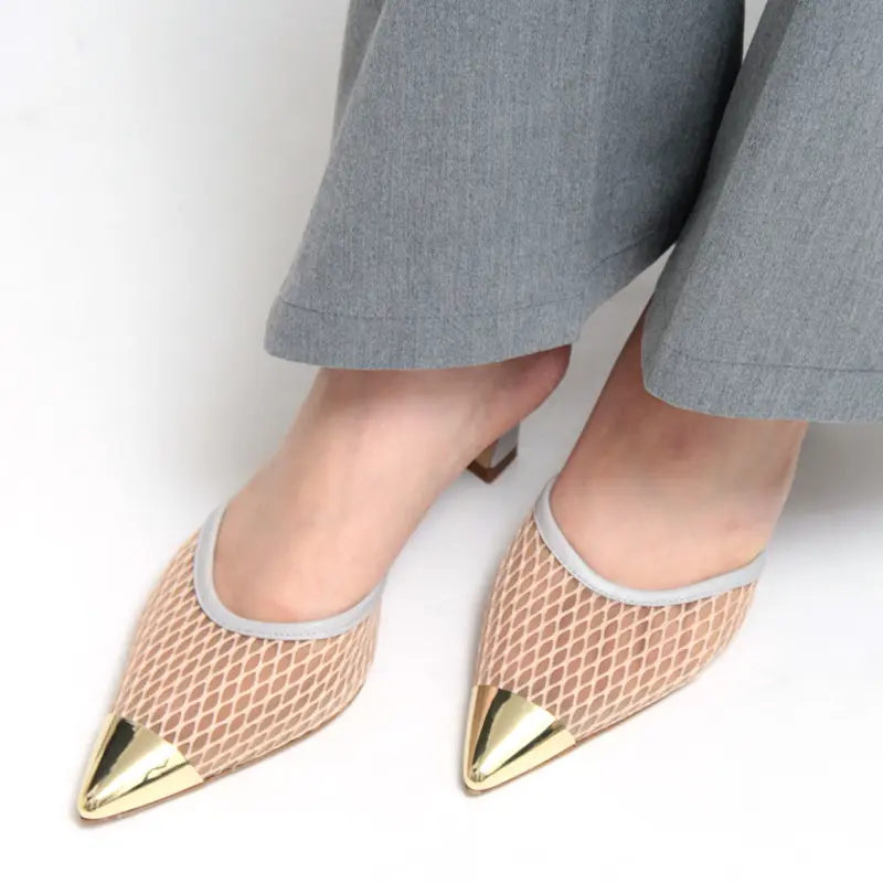 透け感があるチュール素材ときらめくゴールドのつま先でトレンド要素が揃った一足。アッパーはきめ細かいチュールと、粗目のネットとのコンビ。しなやかなレザーでパイピングを施し、足に馴染む履き心地です。