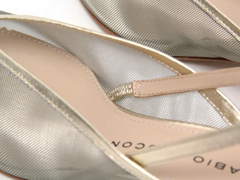 履き口は浅めのVカットデザインで、シャープなシルエットが足を長く美しく見せてくれます。素肌をのぞくセンシュアルなチュール素材はとても軽量なので、足への負担も少なく疲れにくいのも魅力です。