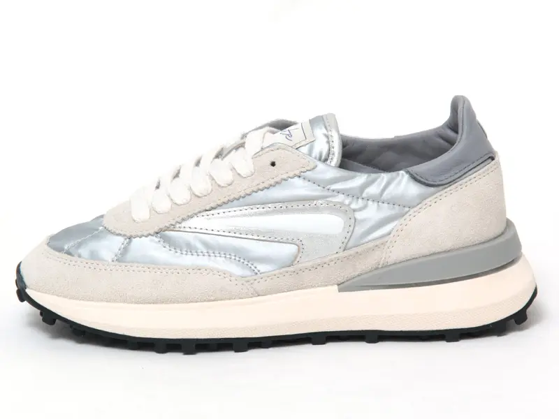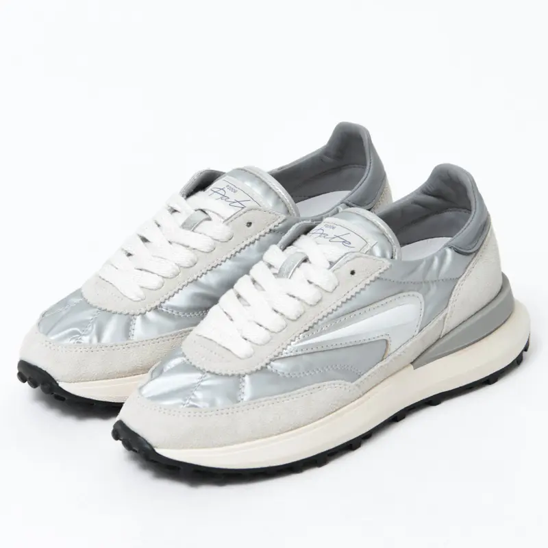 切り替えデザインが特徴的なATHLETA NYLON。シルバーを基調に質感の異なる素材を組み合わせ、ブラックのアウトソールが全体を引き締めています。シューレースは太めの平紐で、結んだ時に立体感が出るため程よいボリューム感をプラス。タン(内ベロ)には手書き風のブランドロゴが施されています。