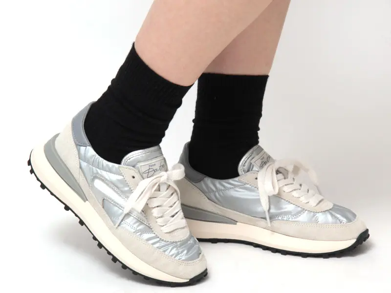 異素材ミックスが特徴的なSS25シーズンデビューの新モデル"D.A.T.E./デイト"のATHLETA NYLON。程良いボリュームソールのぽってりシルエットで、厚底感を出しすぎずに、スタイリッシュな見た目をキープ。スポーティに振るのも、きれいめコーデに合わせるのも自在。白ソールにきらめくシルバーが、どんなスタイルにも溶け込みます。