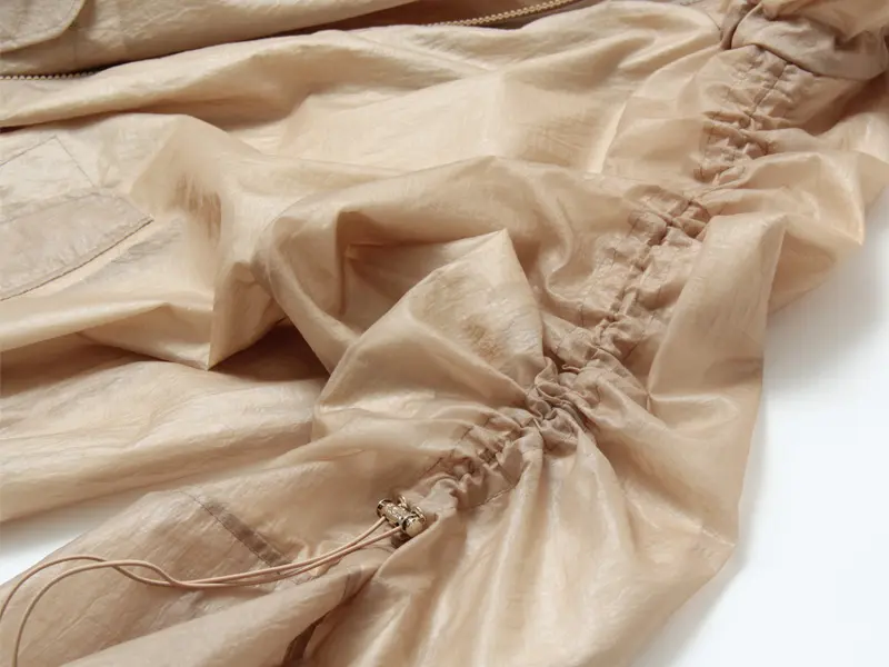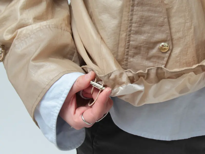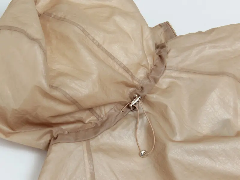 表地は透け感のある軽やなシアー素材を使用。撥水効果もあるので、小雨は気にせずお使いいただけます。デザインもさることながら、機能性も兼ね備えたライトアウターです。