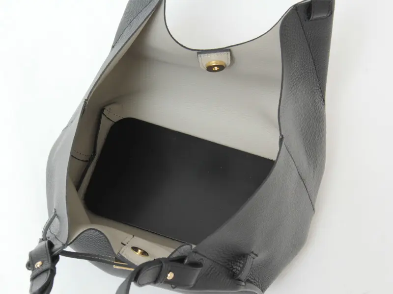 素材はシボ型押しを施したイタリアンレザー。シボを効かせているので傷が付きにくく、しなやかで柔らかな風合いです。裏地を施さず内側に色をのせることで、軽さのあるバッグに仕上げています。細かなシボが美しく上品な印象でお持ちいただけます。