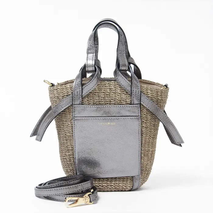 VIOLAd'ORO ヴィオラドーロ MIRO アバカ レザーポケット 2wayかごバッグ (S) V-8624 Wブラウン×シルバー