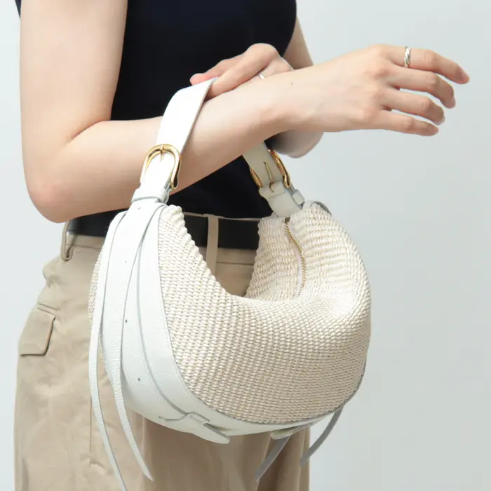 ラフィア調素材と上品な本革を組み合わせた"VIOLAd'ORO ヴィオラドーロ"のワンショルダーバッグ。三日月型のフォルムに、サイドからルーズに垂れ下がる長いレザーコードやベルトがオシャレ心をくすぐるモードなアイテムです。ミニサイズなのでアクセサリー感覚でコーデに合わせやすく、季節感が一気に高まります。