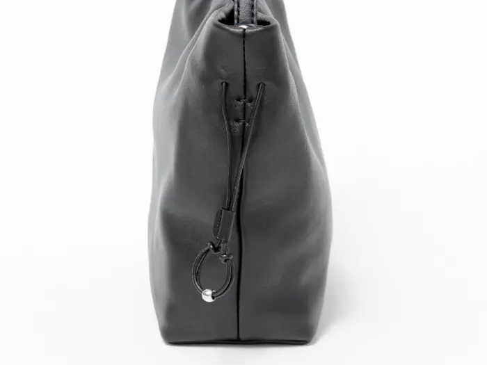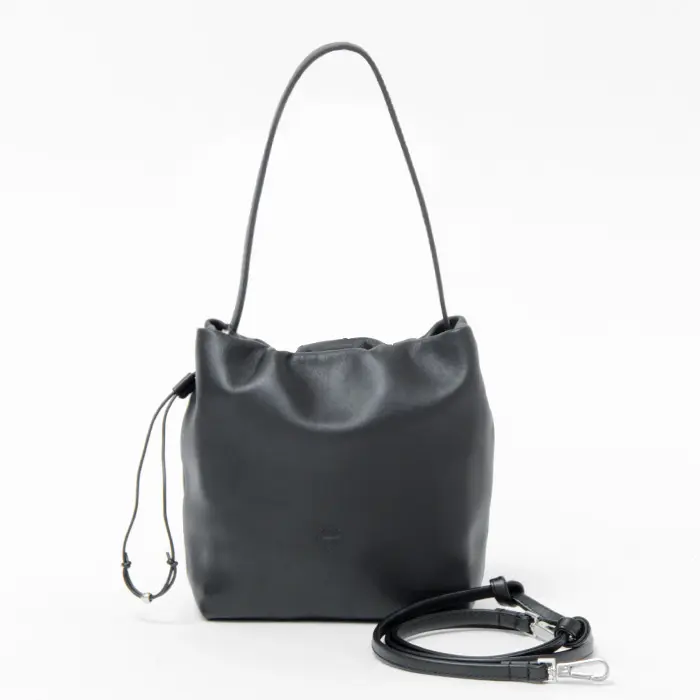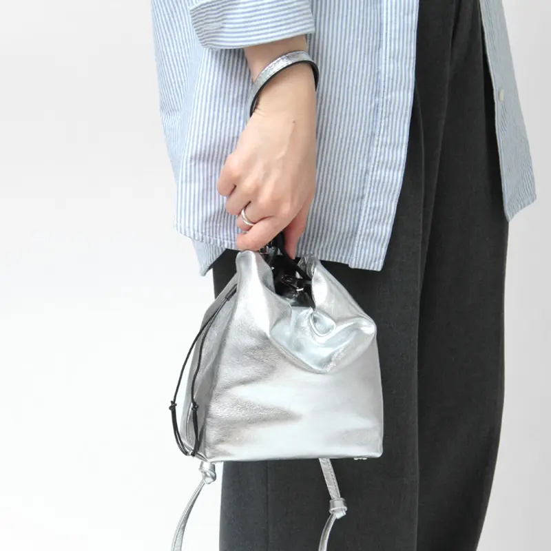 開閉口の巾着をギュッと絞り、ストラップに付属しているスナップボタンでハンドルをまとめるとコロンとした巾着バッグに。くったりとした表情が楽しめ、コーデに抜け感をくれます。