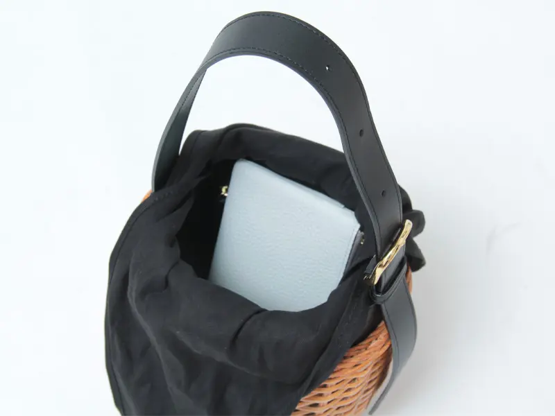 本体には艶加工を施した耐久性の高いスプリットラタンを使用し、フィリピンの職人が手作業で丁寧に編み上げています。ニス仕上げの飴色の艶感が、ナチュラルになりすぎず上品な印象をプラス。牛革との組み合わせが、持つだけで洗練されたこなれ感を演出します。